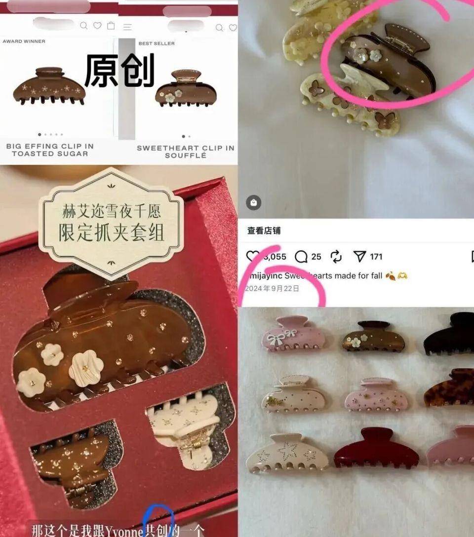 2025年12月,本应是HEIR新品闪耀登场的时刻,却成了舆论风暴的起点。程晓玥与吴千语联名推出的“雪夜千愿”抓夹及礼盒,刚面世便被网友火眼金睛地盯上——其造型、配色乃至装饰细节,皆与美国品牌emi jay的经典款如孪生姐妹。争议如野火燎原,更多产品被逐一揪出“撞脸”:彩色发卡仿若海莉・比伯品牌的复刻;丝绒便携袋的配色与某大牌雷同;润唇膏💄💄外壳则与『奢侈品』牌的设计镜像般相似。连2026年的“cherry”主题,也被发现与小众品牌旧作重合,网友遂讽其为“全方位复制粘贴”。
