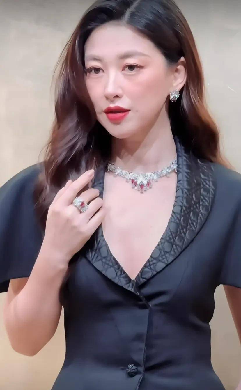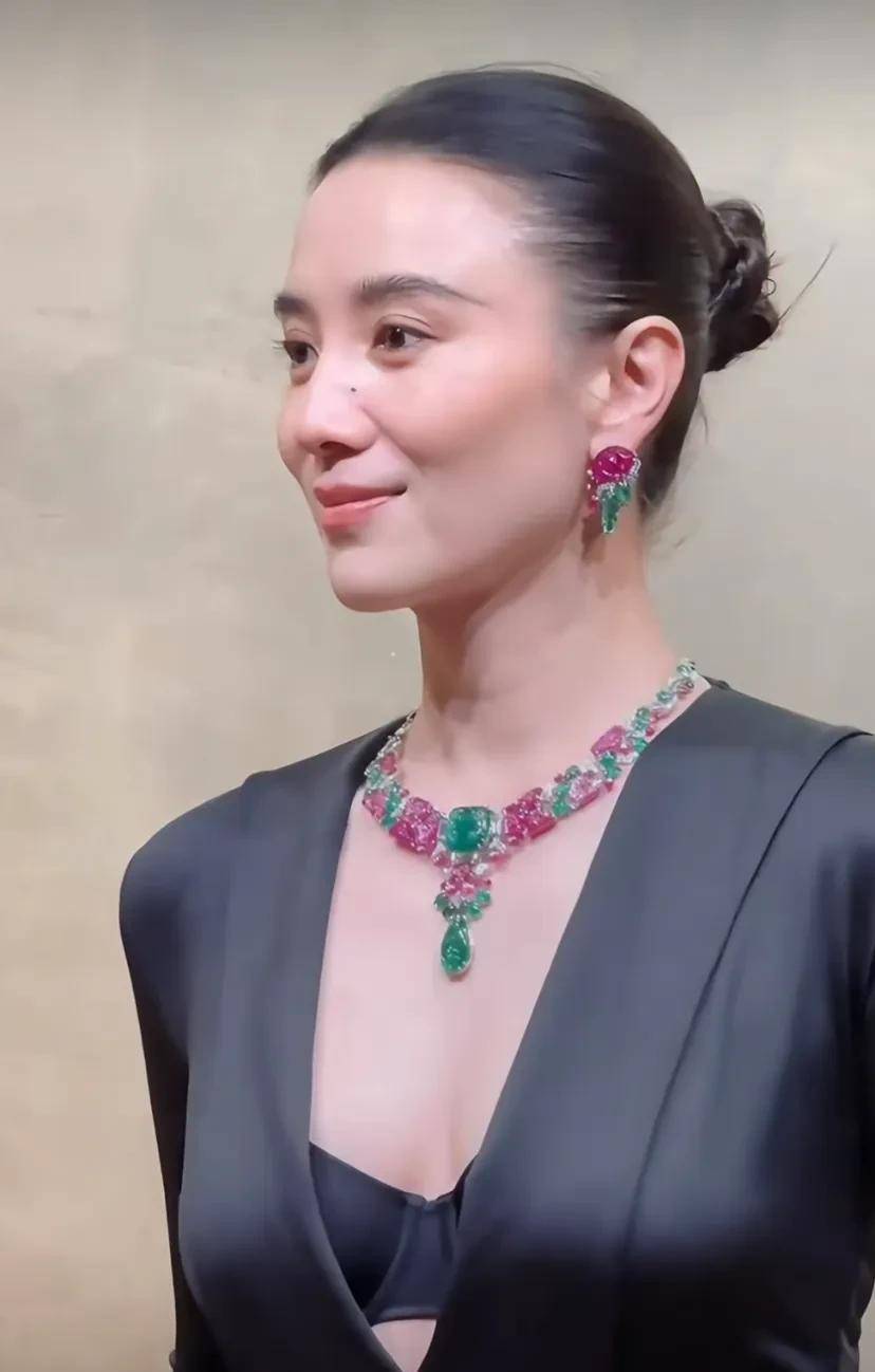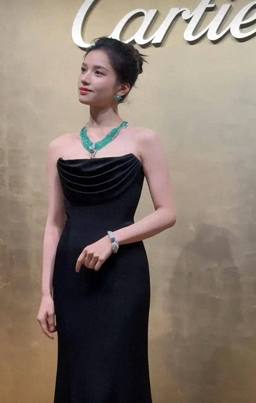 张婧仪,这位被命运格外眷顾的年轻面孔,宛如一株于春风中从容绽放的墨色玫瑰。一袭黑色抹胸裙是她的夜幕,其上点缀的绿色珠宝项链与耳环,则似夜幕中凝结的露珠与萤火,清冷而夺目。利落的丸子头将精致的五官全然托出,她立于光影之中,仪态端方,静默地诉说着一种初具雏形的、不容忽视的华美。