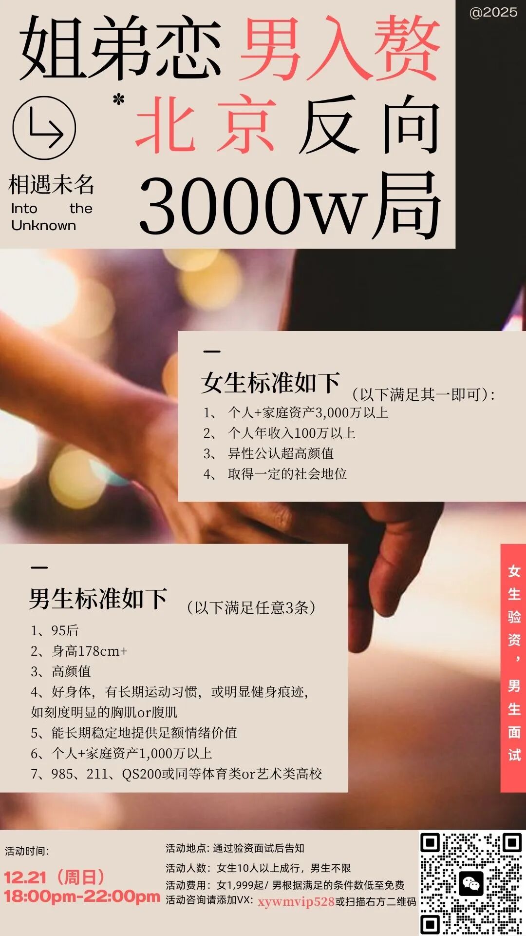 当然如果你觉得3kw局还不够满足你的要求的话,他们26年3月22号周日晚在北京还有A9局,26年5月24号周日晚在上海还有A9局,26年1月18号周日晚在深圳还有A9局。这场活动对男生是验资1个e(个人+家庭资产),或收入500w+;对女生是满足A或B,A是验资1个e(个人+家庭资产),B是97后(含97)、高颜值、985/211/QS200或同等艺术类高校、个人+家庭资产3kw+,四条至少满足3条。报名同样是扫描上方逍遥的二维码。