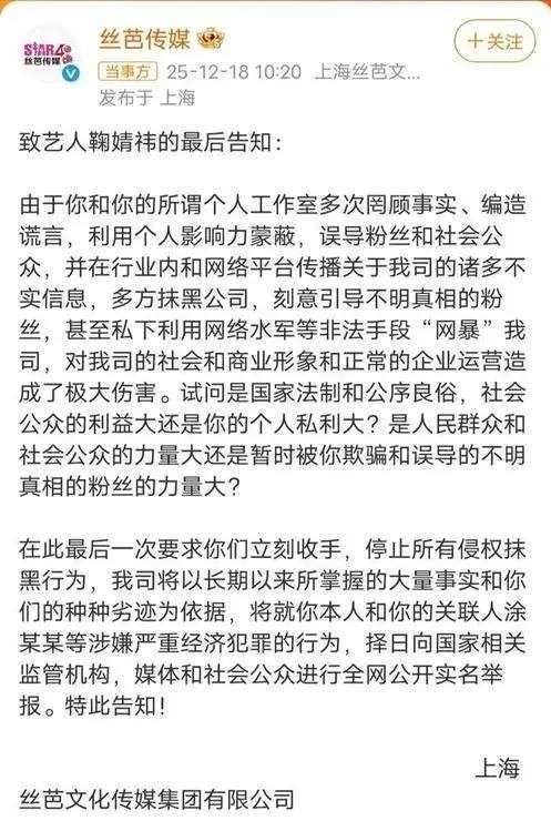 前言 从丝芭传媒公开发布的收入信息来看,『鞠婧祎』的职业生涯似乎十分顺利,收入丰厚。 截至2024年5月,她的税前收入已经累计达到了1.39亿元,每个月的固定工资稳定在25万元,这对于大多数人来说,即便辛苦工作一辈子,也难以达到这样的水平。 然而,令人意外的是,这位拥有巨额财富、住在江景豪宅中的女『明星』️,却被曾经的经纪公司丝芭传媒发出了几乎无情的最后通牒。 丝芭传媒公开发布声明,表示将对她和其相关人员进行实名举报,指控她涉嫌严重经济犯罪。这不再仅仅是普通的经纪合同纠纷,如果经济犯罪被确认,轻则意味着与品牌的解约、项目的停摆,重则可能面临法律追究和个人限制。