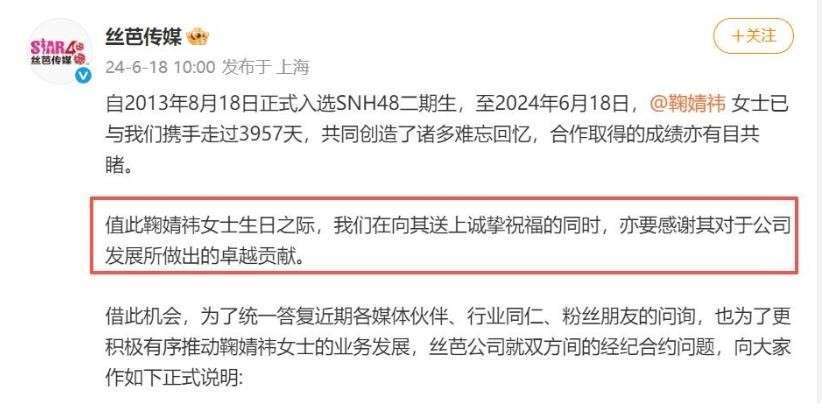 对于艺人来说,这是一堂深刻的课:成名之后不应忘本,契约精神至关重要。 『鞠婧祎』从SNH48的一名普通练习生成长为家喻户晓的顶级偶像,离不开丝芭传媒早期的资源扶持。即使今天地位已经发生了变化,她也应该理性对