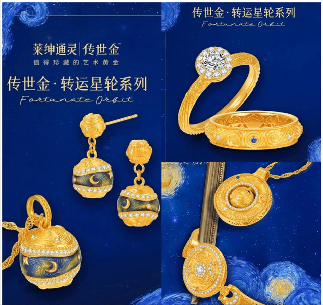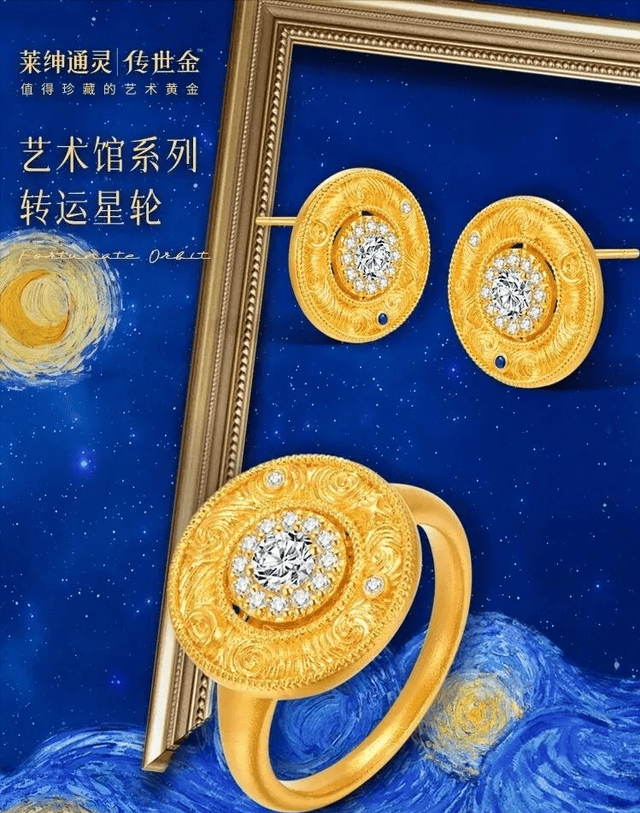 2025 年推出,灵感来自梵高《星月夜》,用 “立体微雕漩涡”“古法砂金”“时空叠彩珐琅” 工艺,金镶蓝宝,星轮可转且双面戴,寓意 “好运流转、有‘球’必应”。