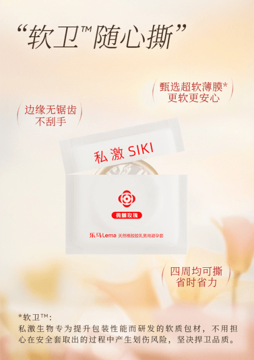 传统双面铝膜在撕开后可能产生金属质感的锯齿状撕裂口,从而在取出安全套的过程中带来一定的划伤风险。相比之下,SIKI私激专为提升包装性能而研发的“易撕方包”就很赞,软质包材+边缘无锯齿设计,就不用担心在安全套取出过程中产生划伤风险,坚决捍卫品质,使用过程中也就更加安全与放心。