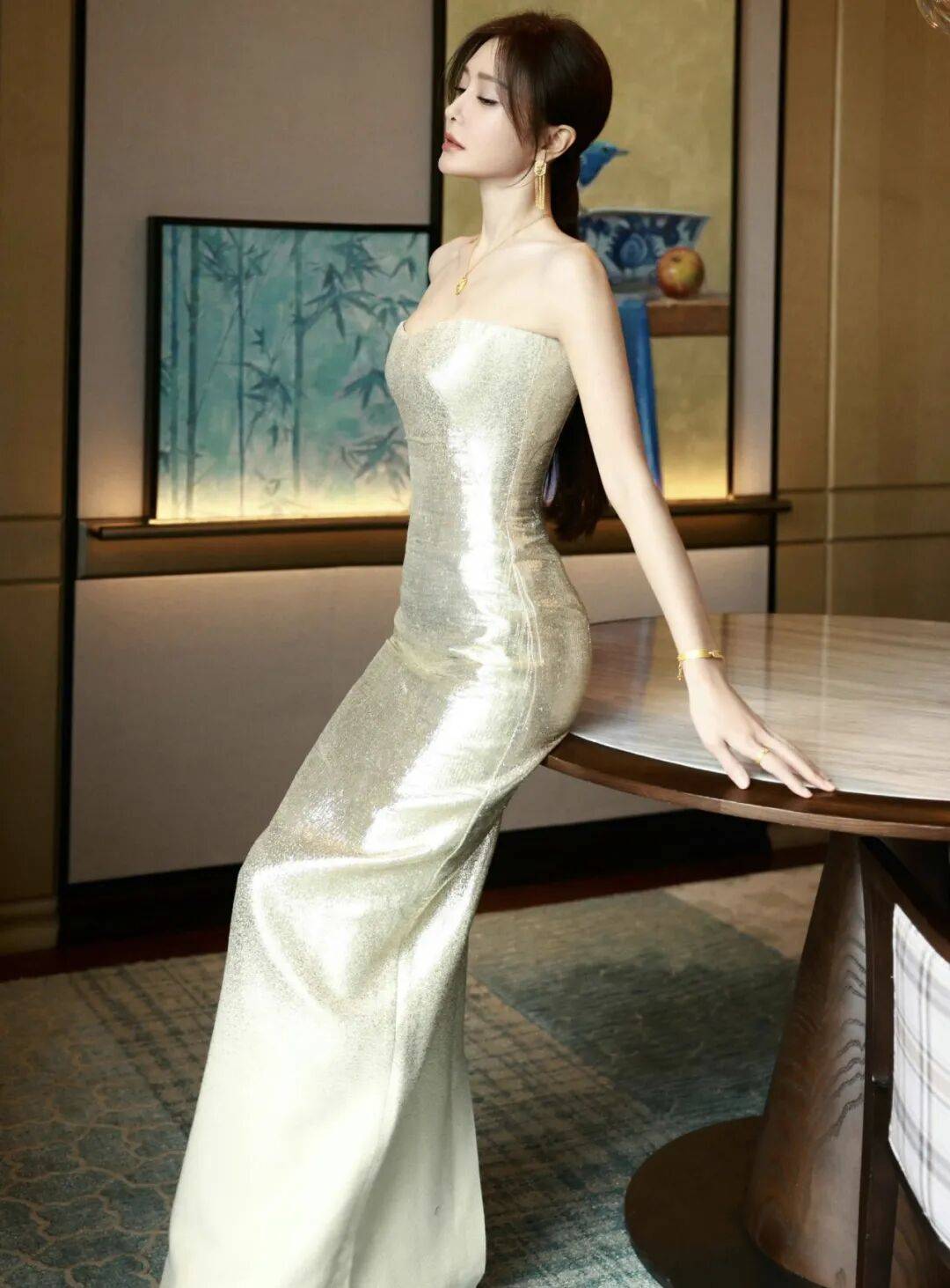 金色紧身抹胸裙包裹着她的身体,像第二层肌肤,却又比肌肤更懂得如何讲述曲线故事。