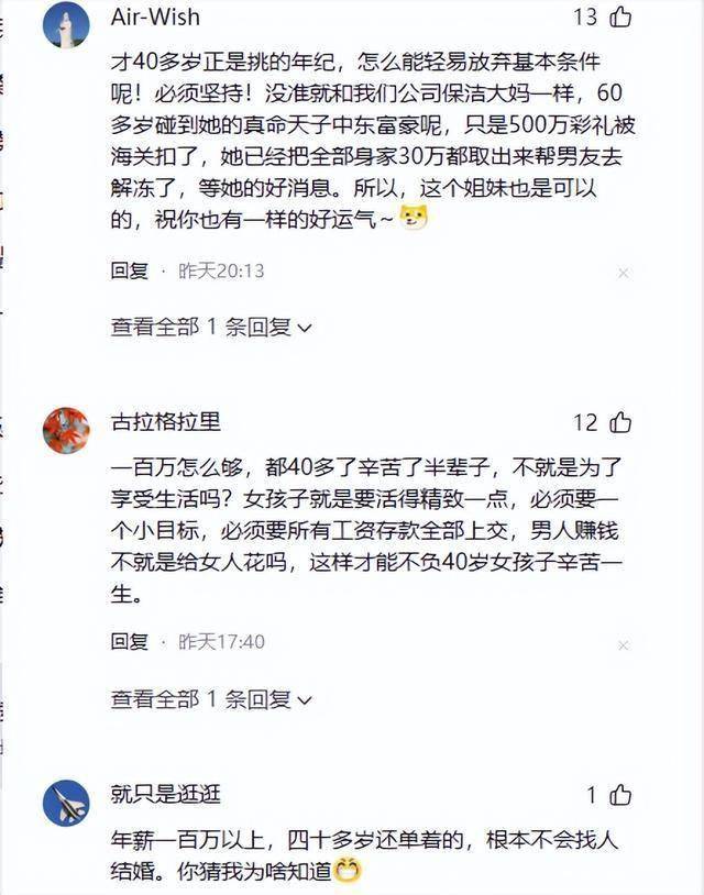 有 网友说,100万怎么够,都40多了辛苦了半辈子,不就是为了享受生活吗?女孩子就是要活得精致一点,必须要一个小目标,必须要所有工资存款全部上交,男人赚钱不就是给女人花吗,这样才能不负40岁女孩子辛苦一生。