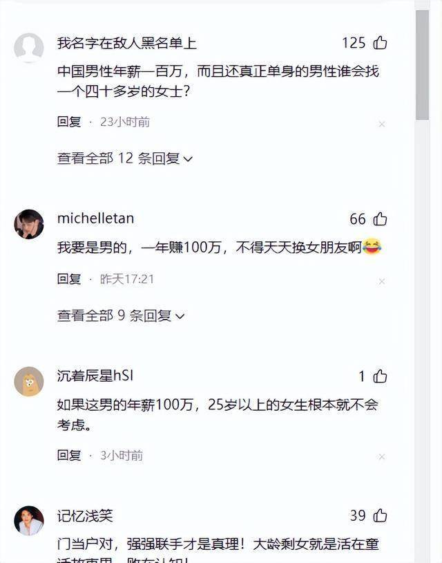 一位40+ 的女生在谈到寻找另一半的条件时,称男子一年要赚100万不是最基本的事吗?
