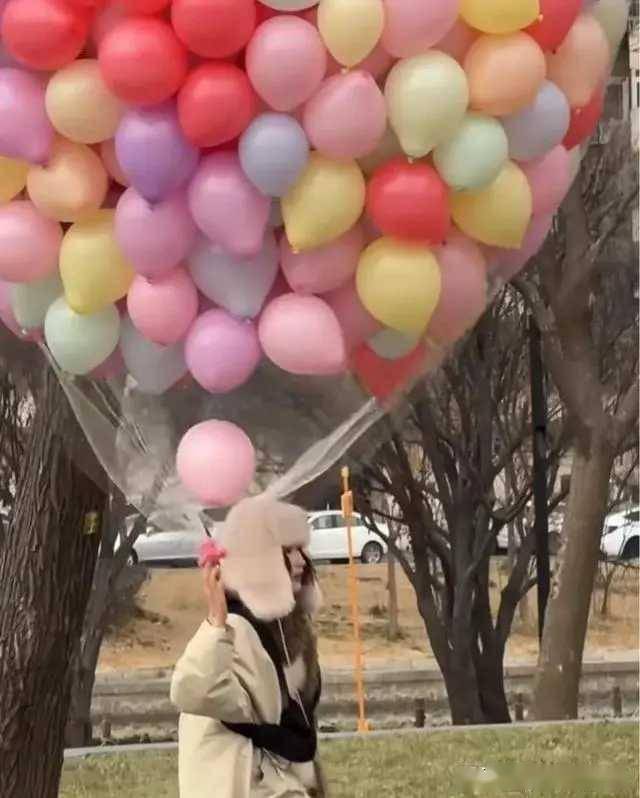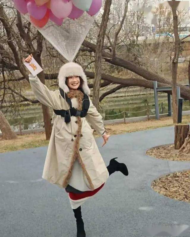 只见她裹着一件白色的长款羽绒服,头上压着个大帽子,整个人缩在衣服里,看着又瘦又小只。最逗的是,她手里、身上挂满了气球,那画面简直萌翻了。要不是知道她是33岁的三金影后,谁见了不得以为这是哪个刚放学、偷跑出来玩的18岁高中生?