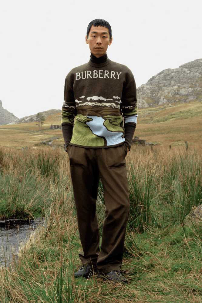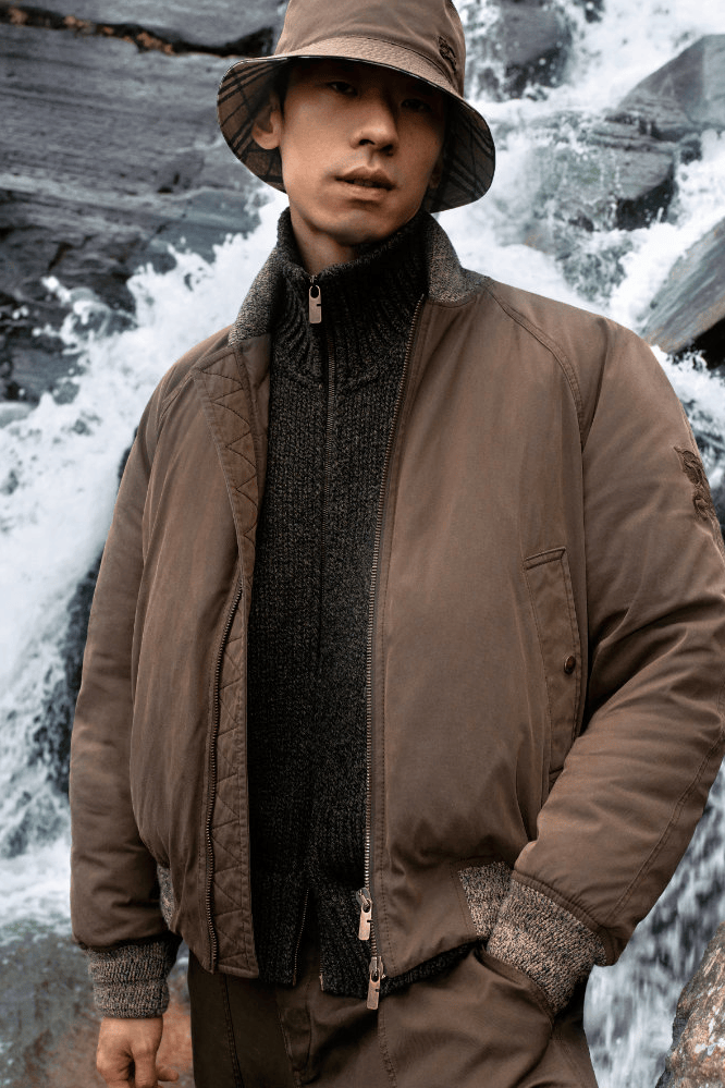 该系列旨在致敬华达呢面料,这种耐候性面料由品牌创始人 Thomas Burberry 于 1879 年发明。经典的外套🧥单品——如派克大衣、羽绒服、绗缝夹克、哈灵顿夹克和飞行员夹克,均采用磨毛棉尼龙华达呢面料重新演绎,并特别以米色和杜松绿两种配色呈现。