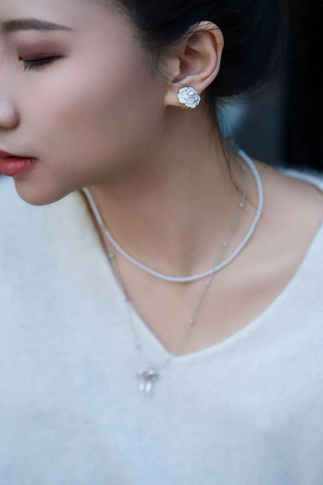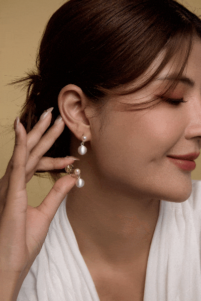 上下两个珍珠珠层次错落,走动的时候会伴随身体律动轻盈摇曳,具有动态美感。
