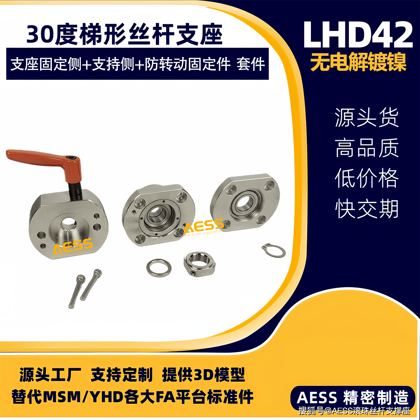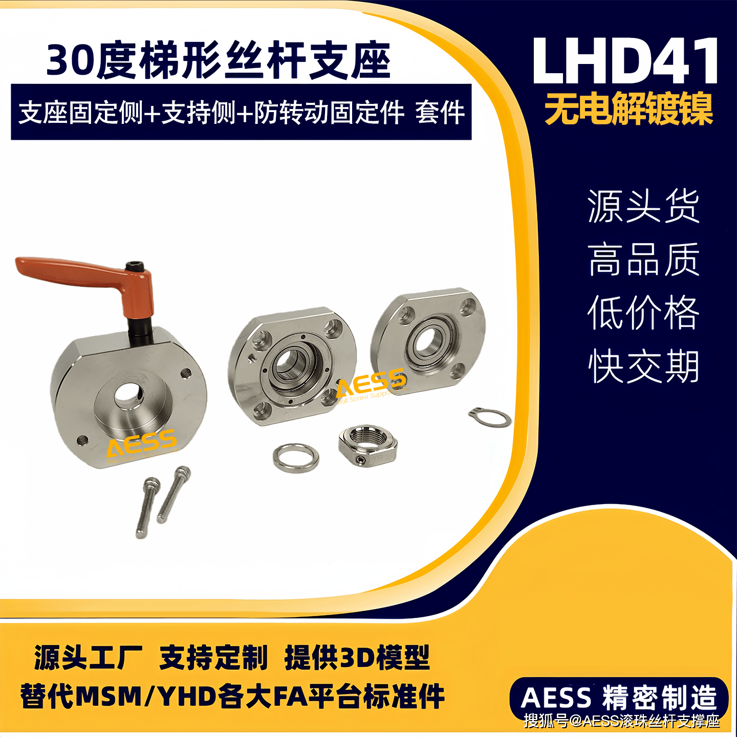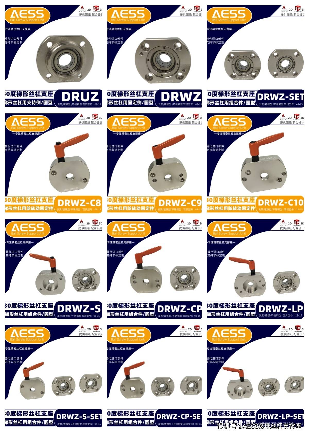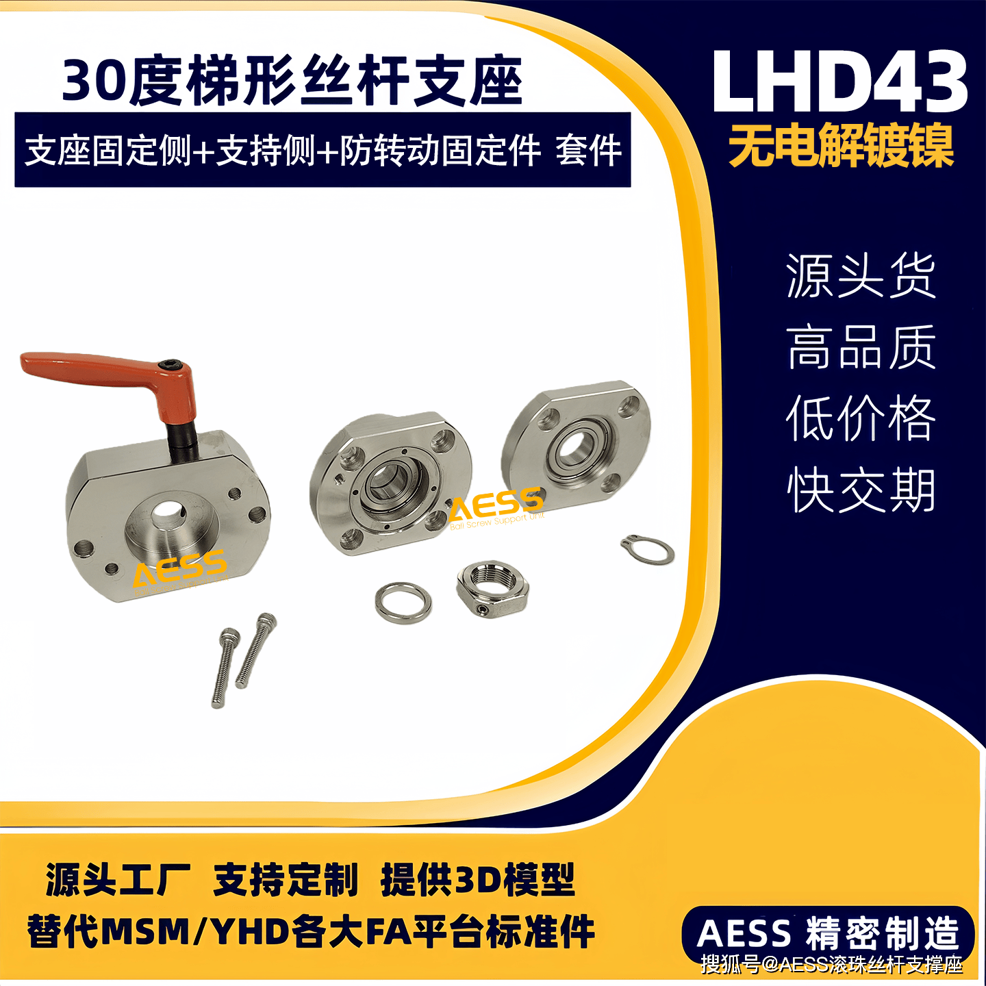 AESS 有 18 年专业研发、生产经验,是全系支撑座生产厂家,可最大限度节省降低采购时间、商品成本。其丝杠支撑座和梯形丝杠支座可完美替代米思米和怡合达等精度标准件型号,专注工厂自动化标准零件替换、非标定制一站式服务,能够根据客户的特殊需求,提供定制化的丝杆支撑座产品,满足不同客户的个性化需求。可以支持表面处理有发黑,镀镍、镀黑铬,材质有不锈钢材质,铝合金材质等,我们工厂能支持不同材质的定制,不同表面处理的定制。全品类型号标准件库存现货,现货急发,交货期快,支持提供2D/3D图纸技术支持!