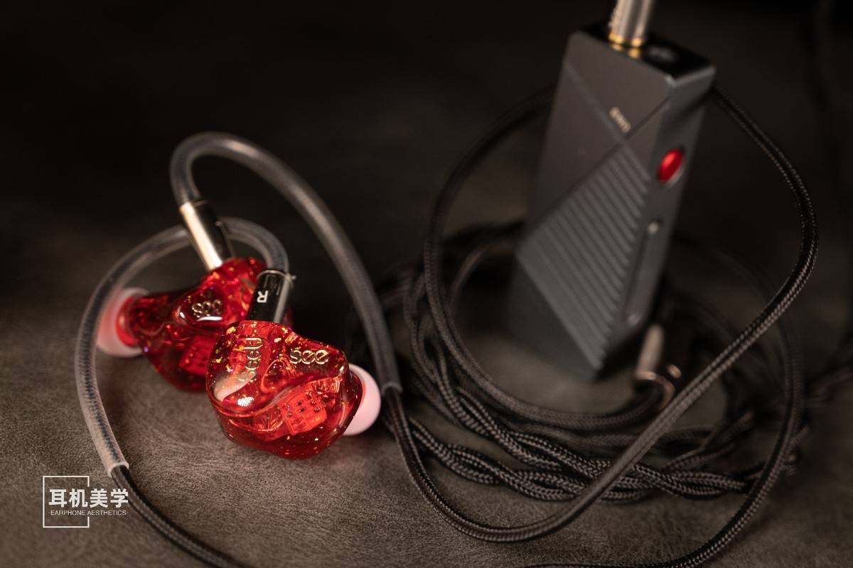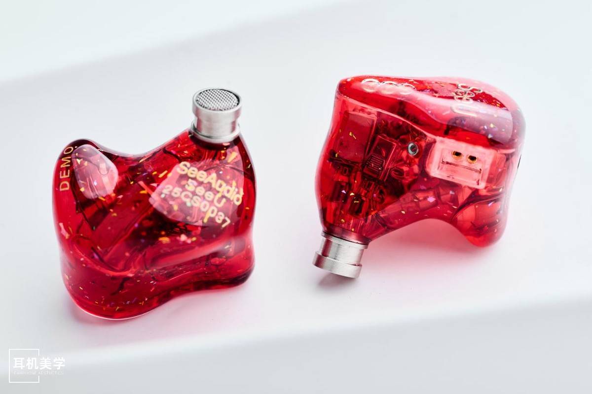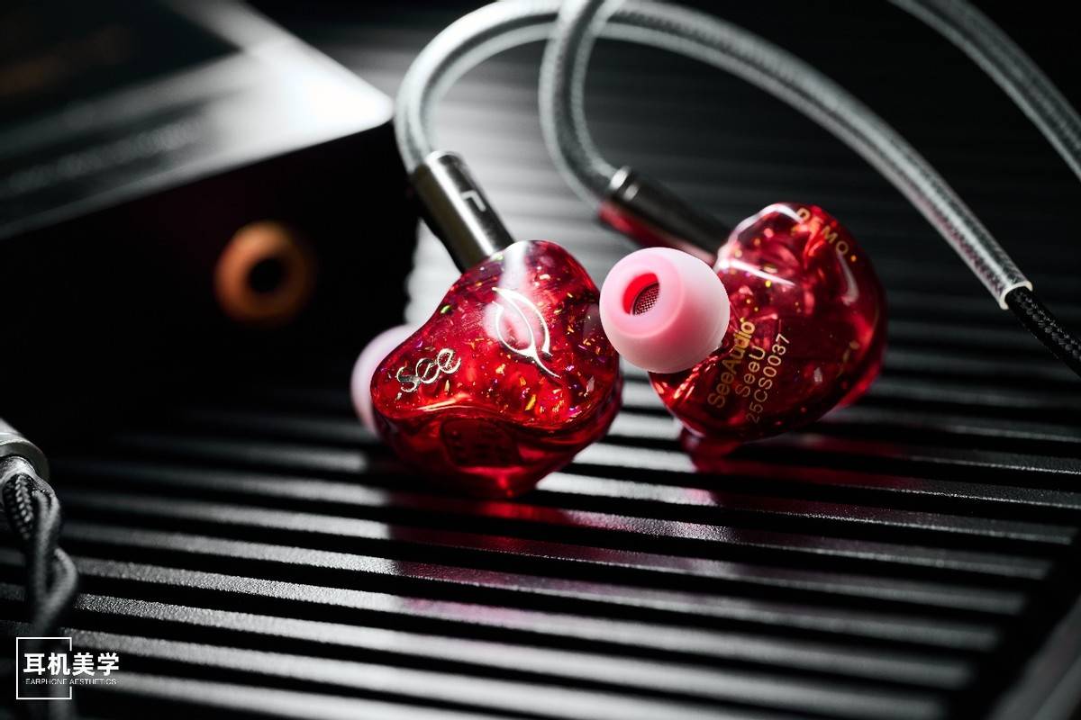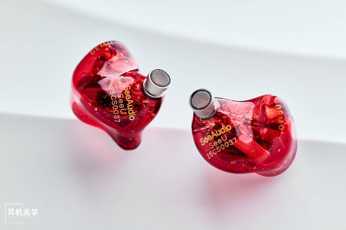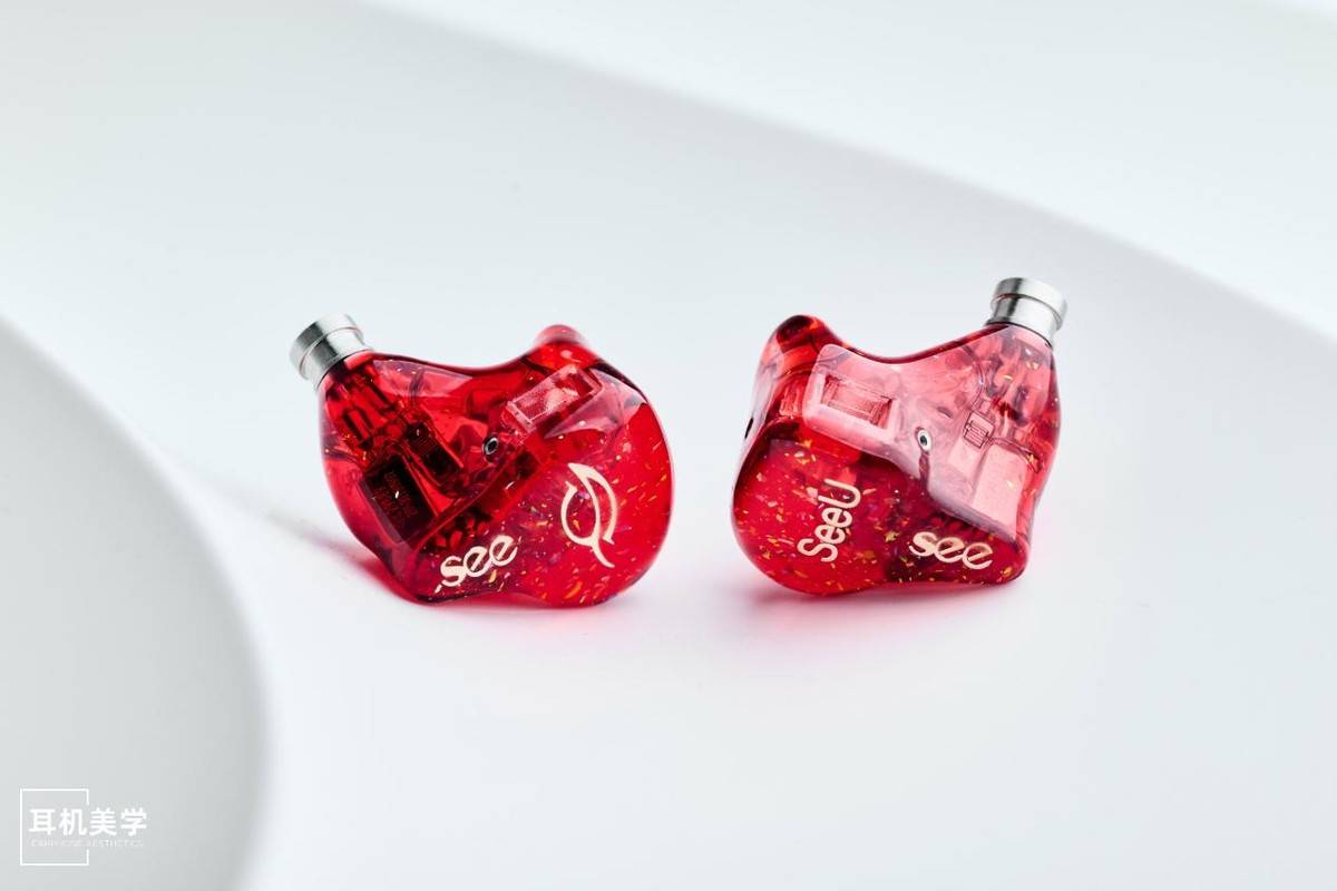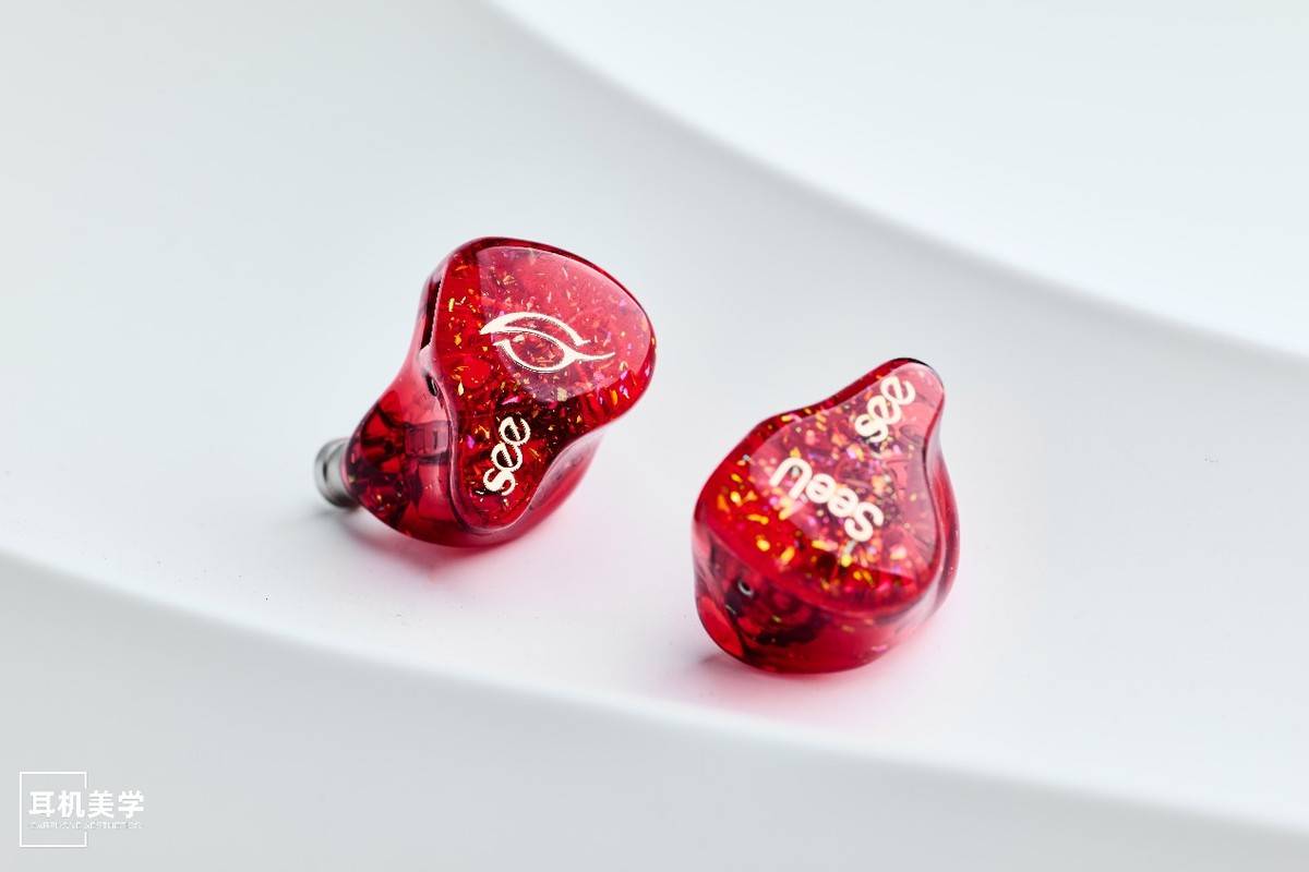 外观部分,SeeU与SeeAudio之前的限定产品“麻婆豆腐”有较高的相似度,都采用高反光、深红色的透明树脂。不同的是SeeU的壳体表面还点缀着金箔和粉紫色亮片,亮晶晶的,长得像颗糖果。至于造型完全符合人体工程学,耳甲腔和三角窝处设计得非常饱满,加上耳机导管不长,佩戴贴合度非常高,隔音效果也很不错。