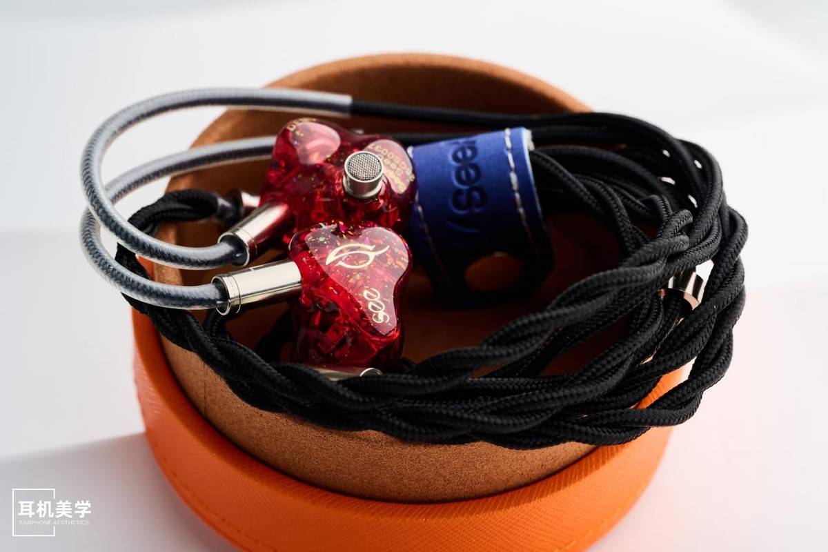 配件方面,SeeU附赠了一个橙色的圆形收纳盒、五对常规耳机套和两对海绵🧽套。收纳盒表面带有防滑凸点,质地偏硬,摸起来有类似布艺的触感。线材方面,SeeU 采用了一根单晶铜镀银线,标配4.4mm平衡插头。线身包裹黑色棉网,仅分左右两股,线径细、质地软,佩戴亲肤且耐拉扯,外观简洁干练。不过它也相对容易缠绕,偶尔需要整理一下。