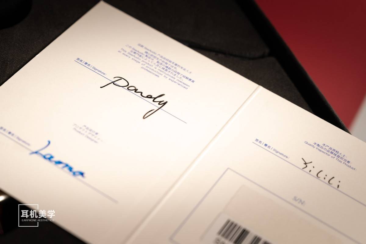 开箱过程也充满仪式感。除了耳机本身摆放得体,盒内还有一张印有产品『设计师』和质检人员亲笔签名的卡片。这些小细节让人感觉不像在开箱普通耳机,更像在开启一件高端定制产品。