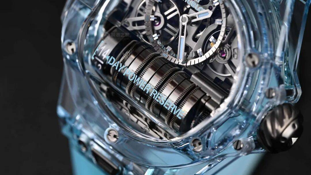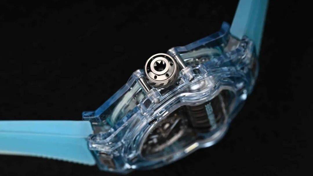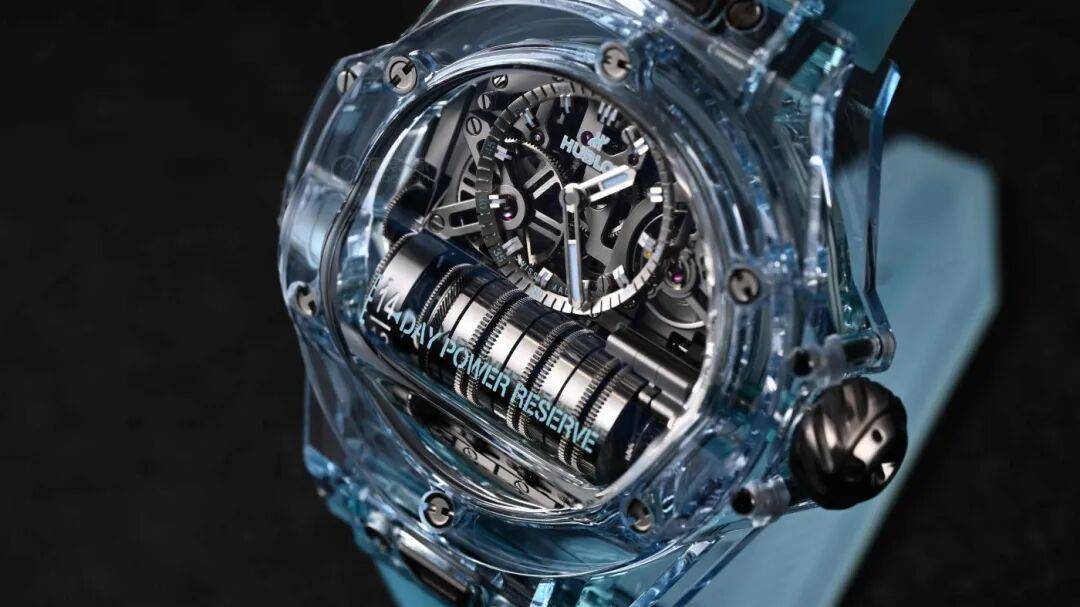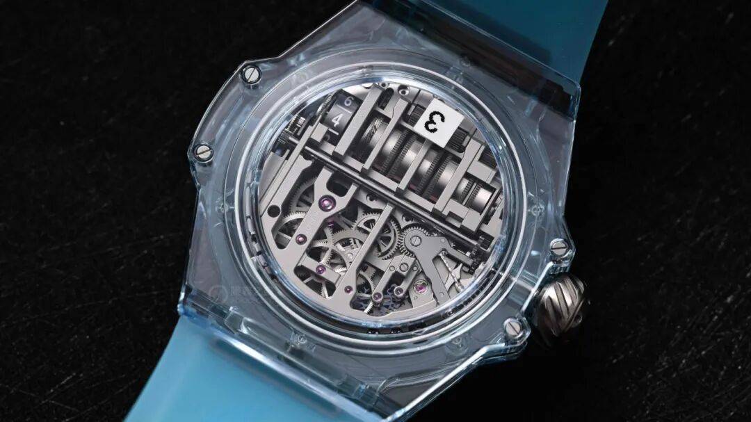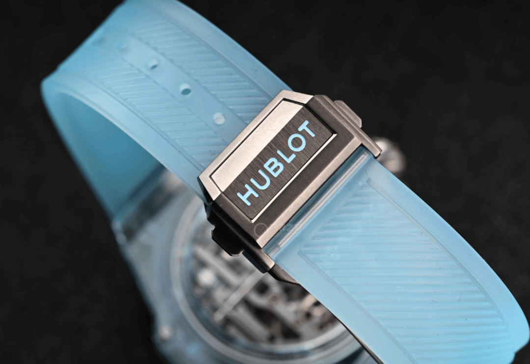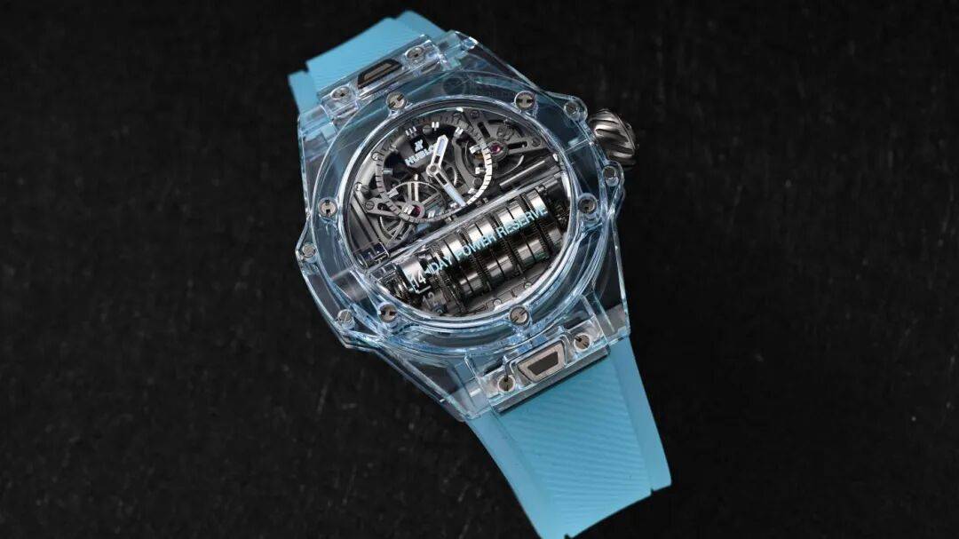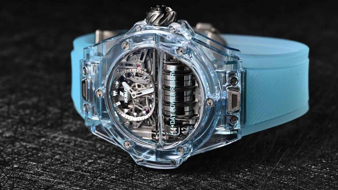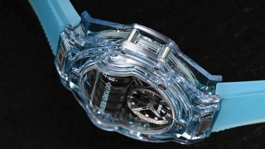 在2024年的Big Bang MP-11腕表(型号:911.JL.0129.RX)中,宇舶通过全新的化学配方定制而成,推出了一种全新的水蓝配色的蓝宝石表壳,在我看来是真正的冰蓝色。不仅有着专属的透明度指数,而且还能保证蓝宝石本身坚固耐磨的稳定性。独特而特别特别美妙清透的冰蓝色蓝宝石表壳经过宇舶典范级别的抛光工艺。