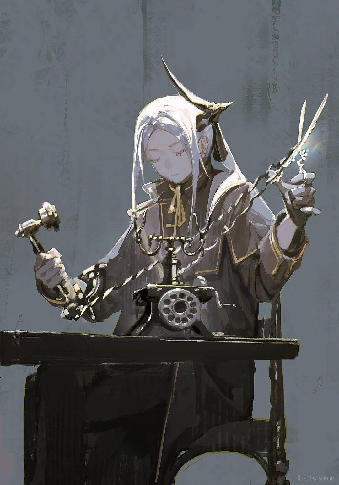 少女背身而坐,剪刀插入散落的发丝,安静之中带着一丝破碎的情绪。