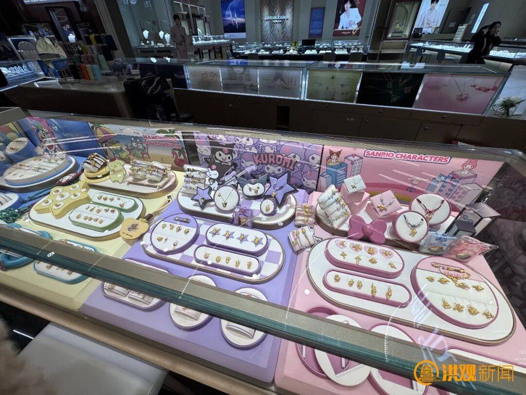 日前,记者走进南昌武商MALL某金店,展柜被粉紫、浅黄等马卡龙色系的陈列台铺满,左边的三丽鸥主题区里,布丁狗、库洛米造型的足金串珠在射灯下闪着柔光,串珠旁还摆着同款卡通立牌;中间的蓝色展台主打泡泡玛特DIMOO系列,足金吊坠被放在『云朵』形状的展示架上,连标价签都印着DIMOO的可爱图案。