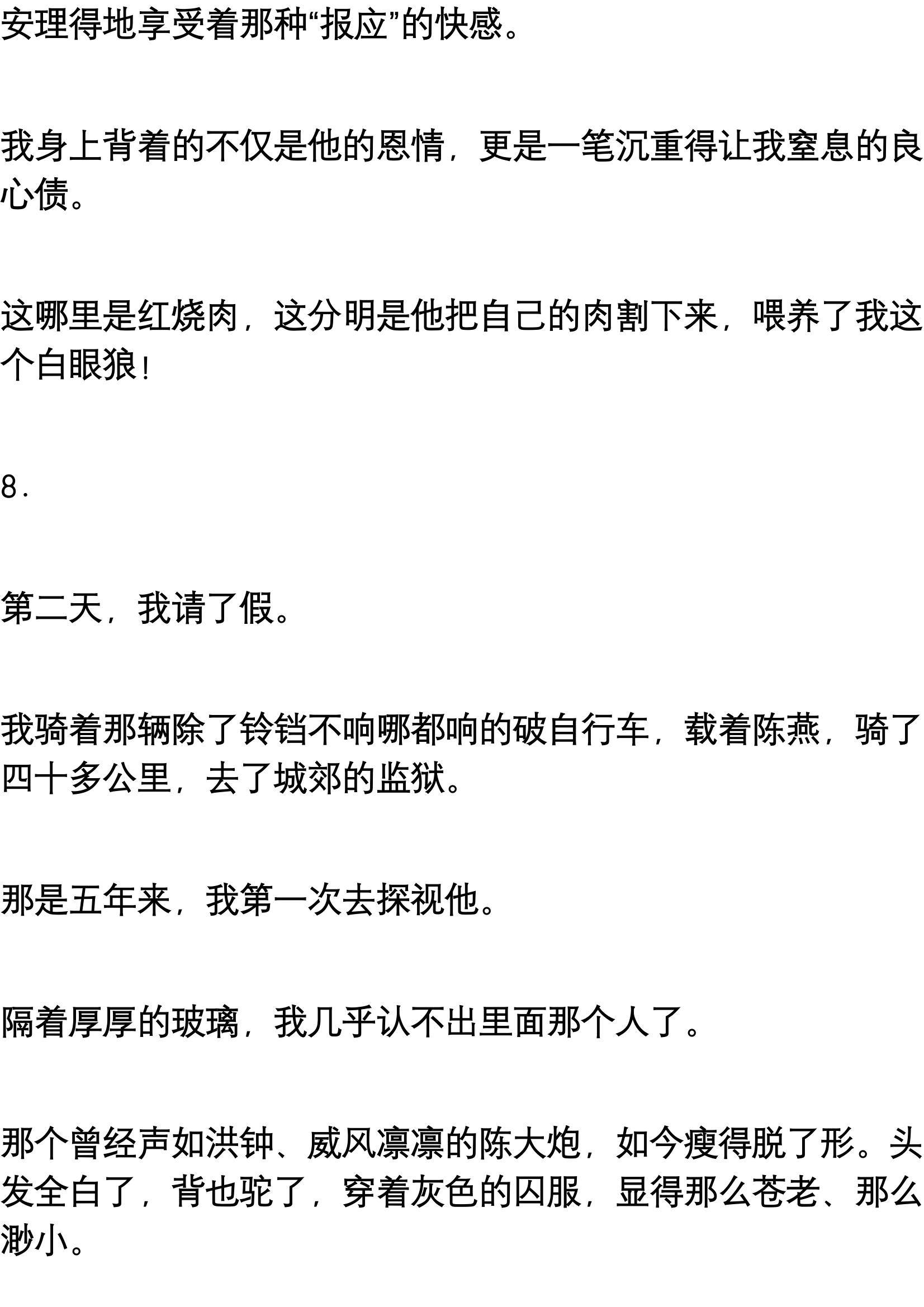 陈大炮深深地看了我一眼。那眼神很复杂,我不懂。那时候我只觉得,那是胜利者的炫耀。