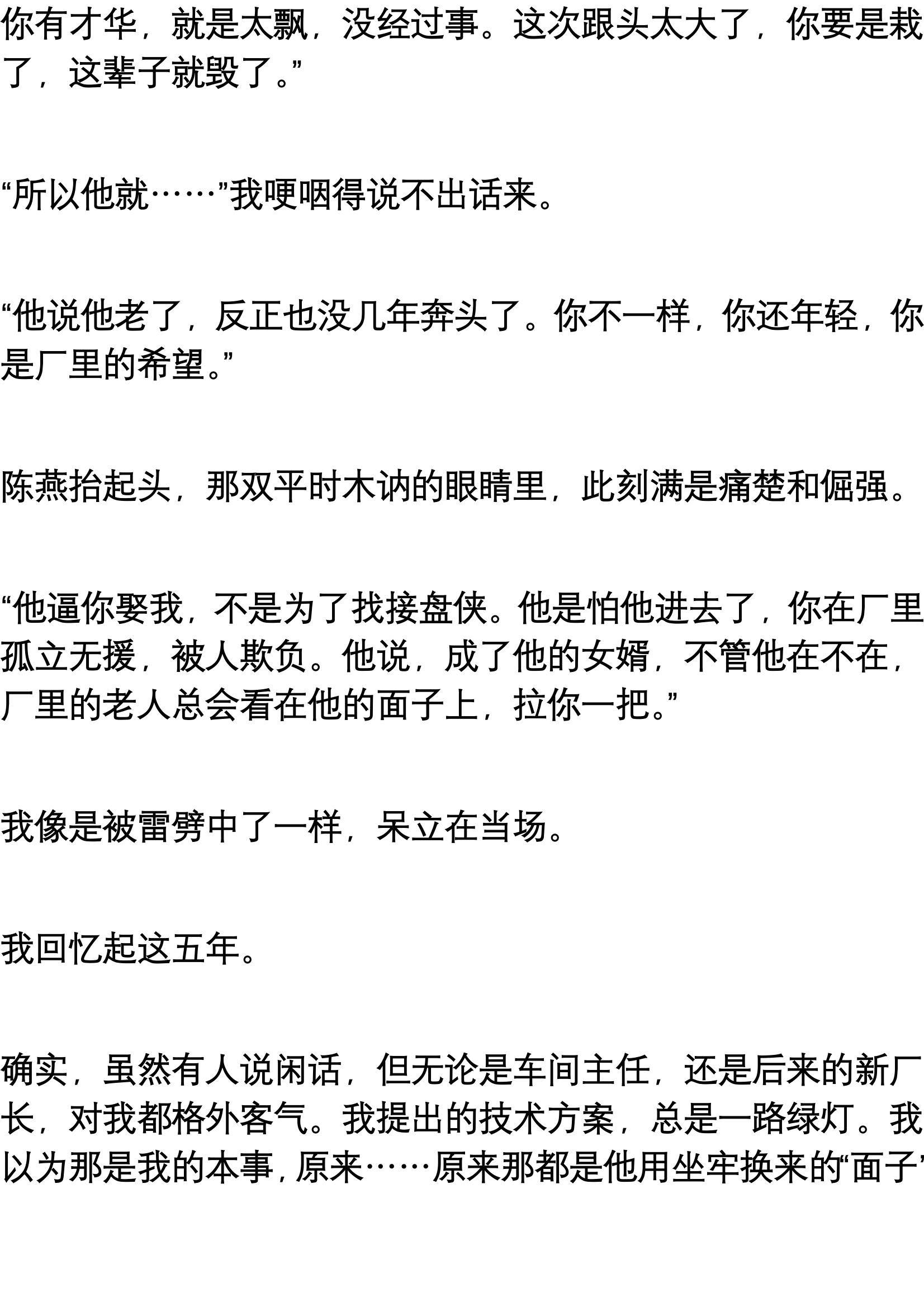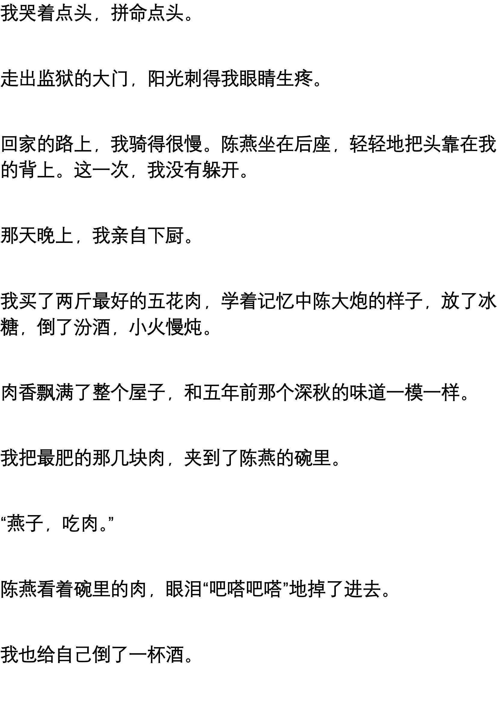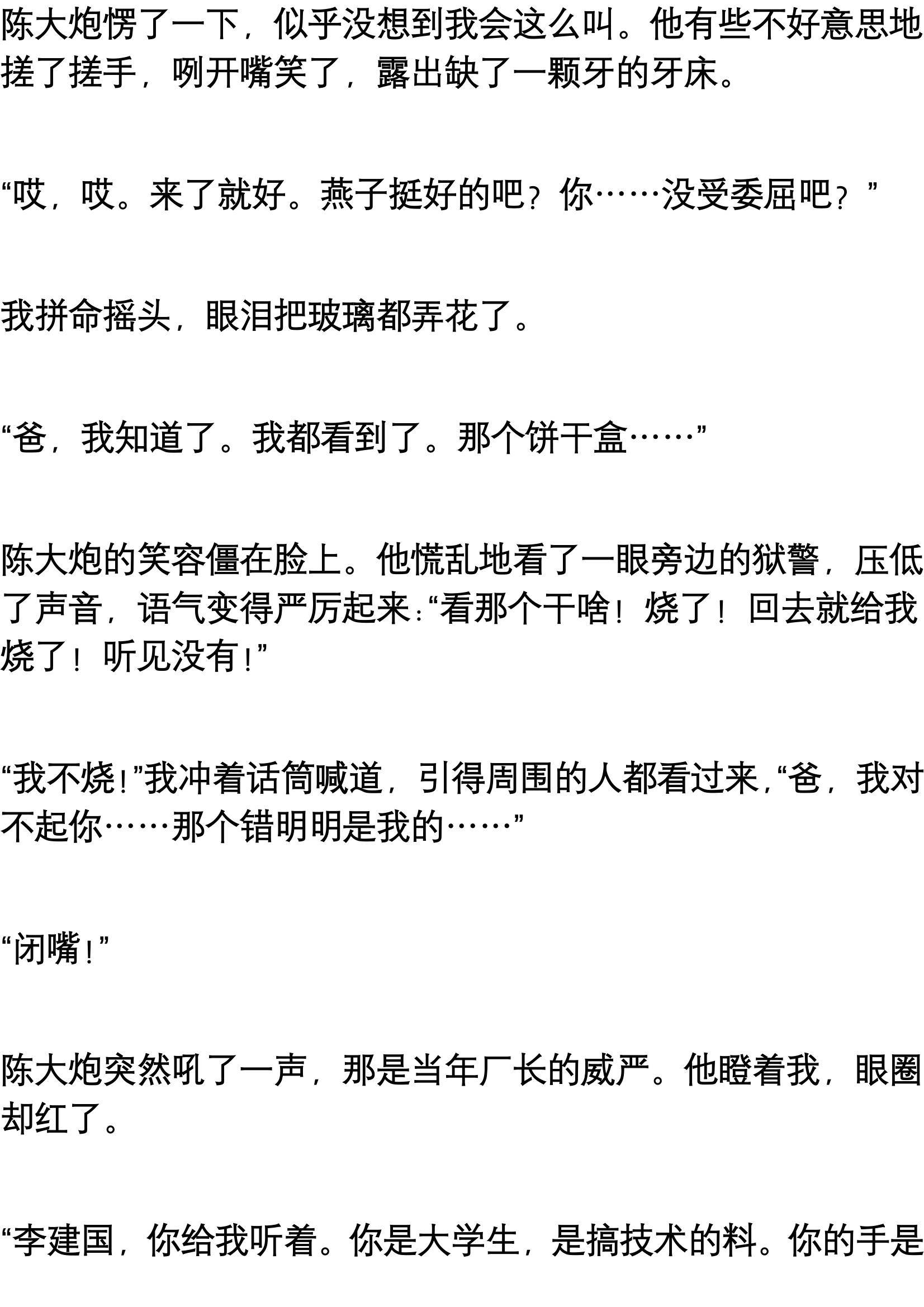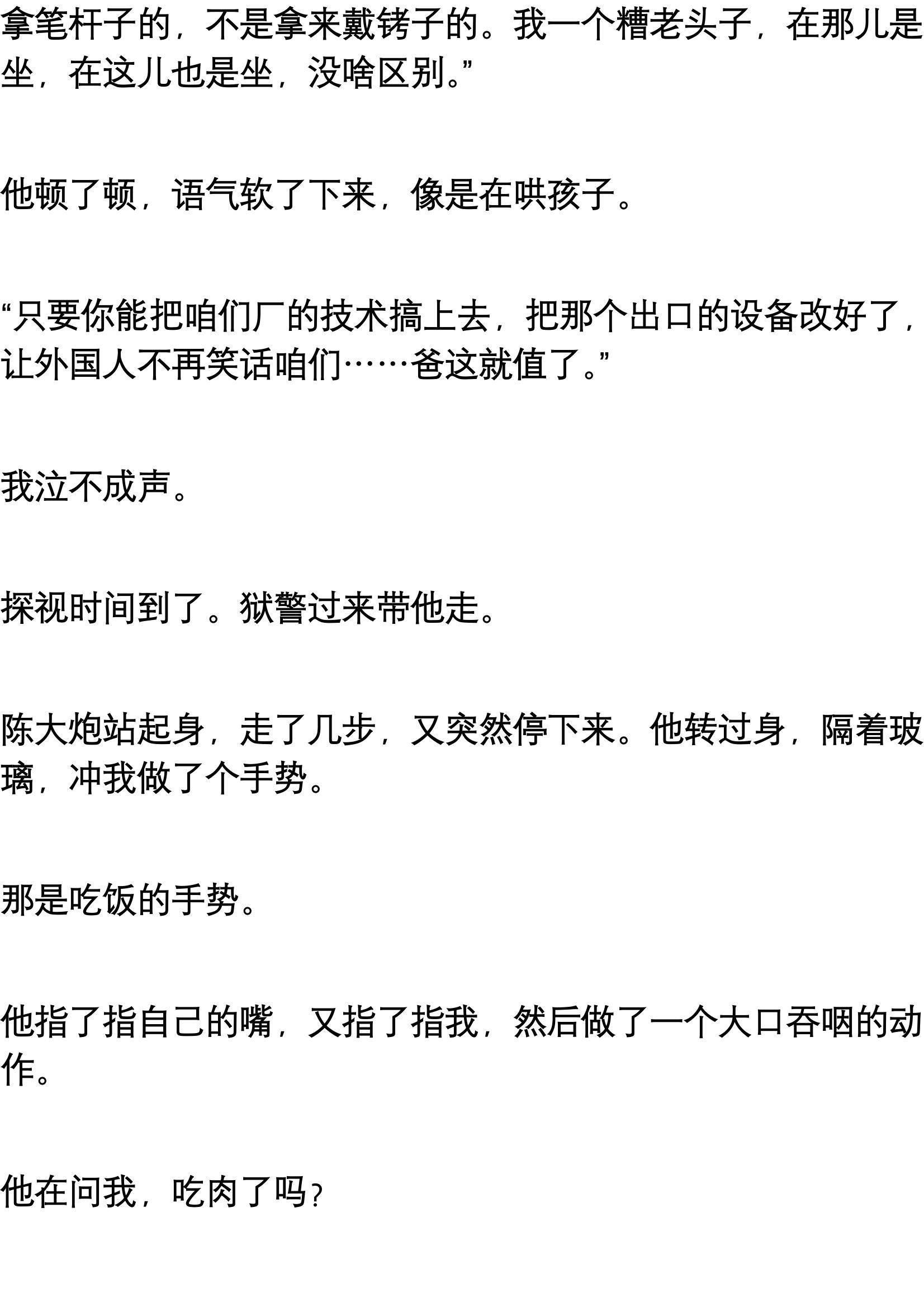 每次吃饭,陈大炮总是把最肥那几块夹到我碗里,自己只吃肉皮,或者用汤汁拌饭。他还总劝酒,那是高度的汾酒,几杯下肚,我就觉得自己是个英雄,把厂里的技术革新方案吹得天花乱坠。