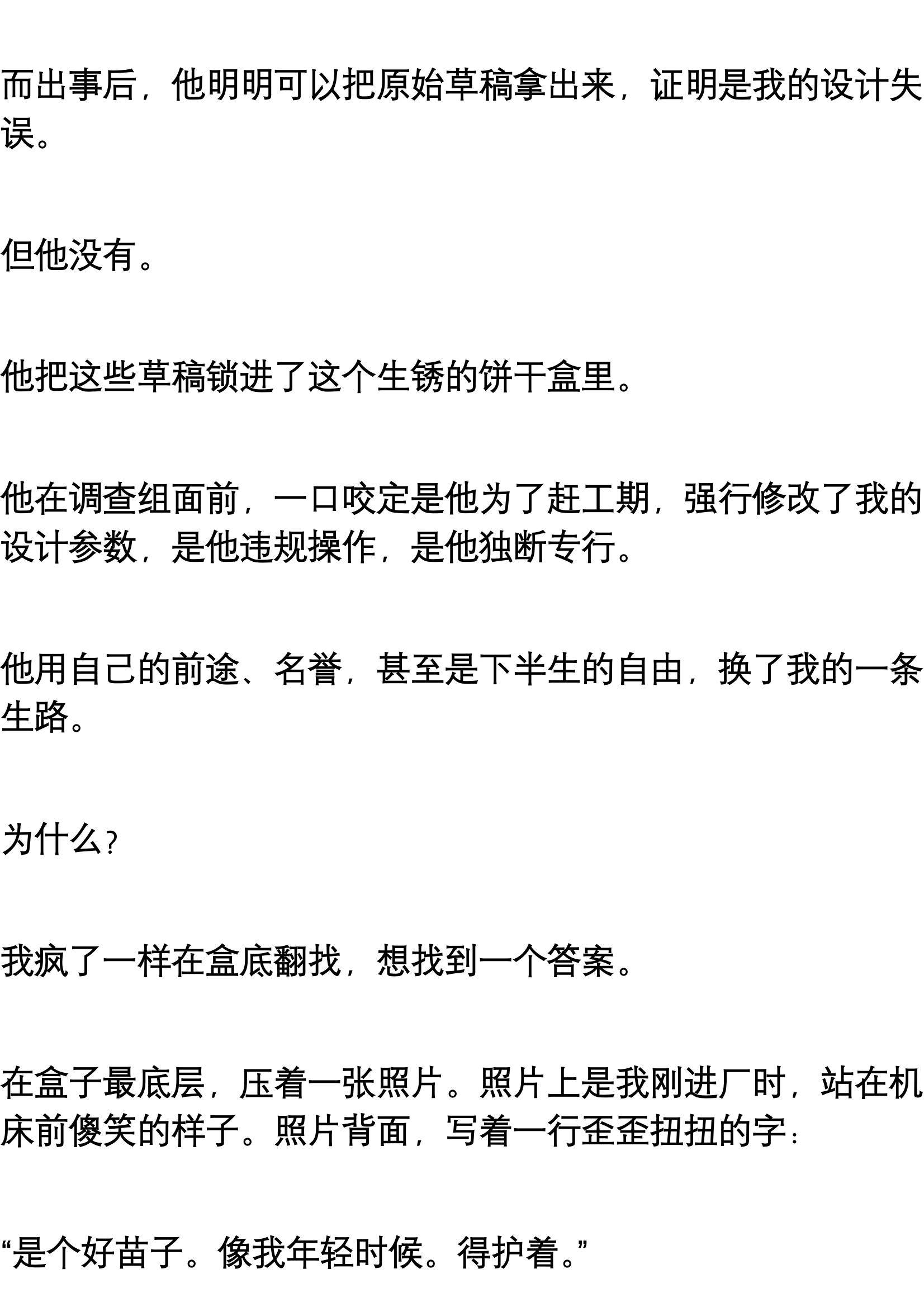 他进去后,厂里进行了大清洗。但奇怪的是,我这个“主要设计者”却奇迹般地保住了位置,甚至因为在那次事故后的整改中表现突出,被提拔为了技术科副科长。
