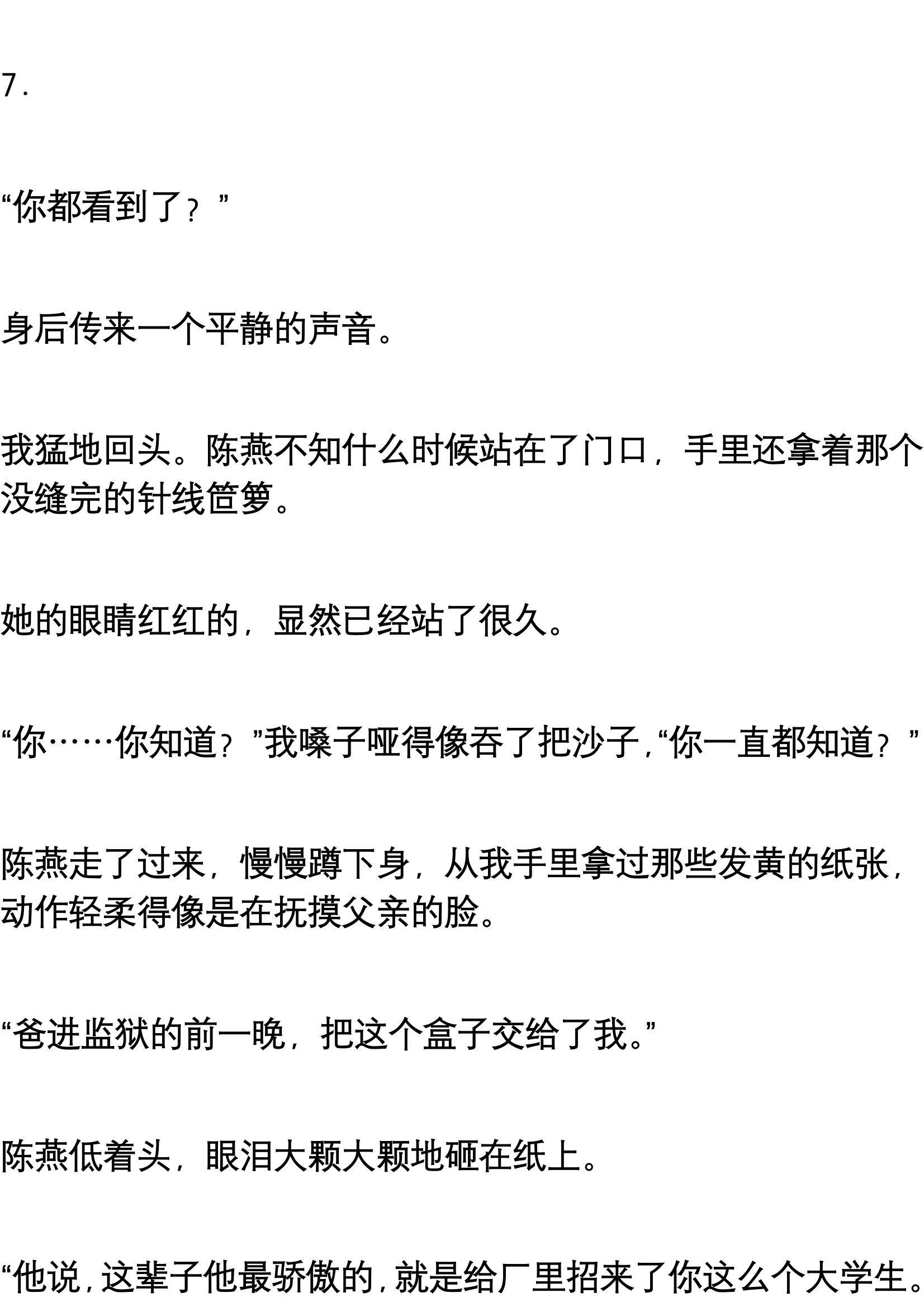 陈燕坐在沙发上,没有哭,只是在缝补一件我的工作服。那是她第一次在我面前展露出明显的情绪波动——她的手一直在抖,针尖几次扎破了手指。