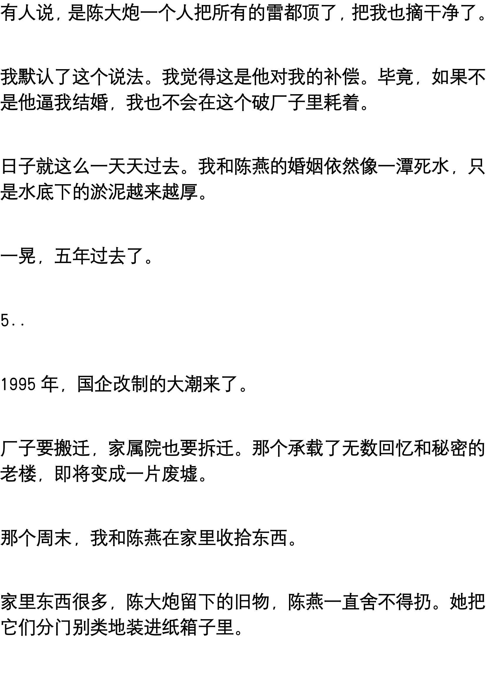 没有我想象中的盛大婚礼,甚至连几大件都没凑齐。陈大炮在这个厂里当了十年厂长,家里却并没有多少积蓄。