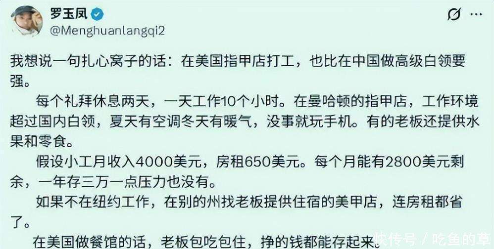当初的美国梦,最终却成了空欢喜。如今的罗玉凤,依旧蜗居在狭窄的出租屋里,做着打工的体力活。她口中的4000美金月薪,在物价飞涨、医疗费用高昂的美国,实际上连看个病都成问题。曾经在上海街头发传单的凤姐,现在却在纽约的美甲店里做着一份辛苦的工作,现实的轮回充满了讽刺。她以为离开原生家庭、逃离曾经的偏见,就能获得新生,但她忘了自己并没有跨越阶层的资本。现在,即便她想回国,恐怕也早已失去了面对亲友的勇气。这种通过言辞自我安慰、借虚拟的优越感填补内心空虚的做法,更多的是一种自欺欺人的心理安慰。 罗玉凤用一生的代价去追寻那个虚无缥缈的美国梦,最终却输掉了所有。她口中所谓比白领强,不过是在自我安慰中构建的一个虚幻的世界,无法掩饰她那一口破损的牙齿和衰败的生活状态。人生最难的,不是追求高处,而是认清自己的位置,不被虚荣心蒙蔽双眼。那片看似自由的土地,未曾带给她预期的救赎,反而成为了束缚她后半生的囚笼。愿罗玉凤在她热爱的土地上,能用那4000美金修好满口的牙齿,活得有些许尊严。