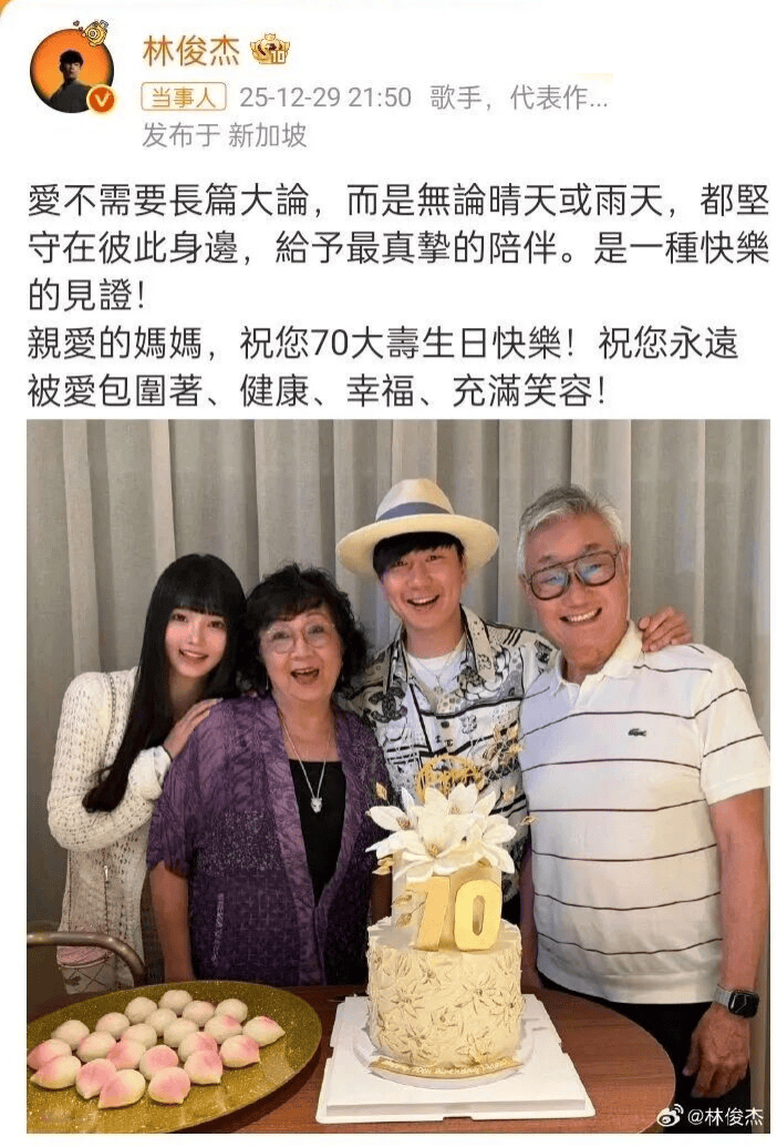 『林俊杰』在微博发布母亲70大寿的庆生照片中,他站在父母中间,笑容满面,温馨溢出颜表。
