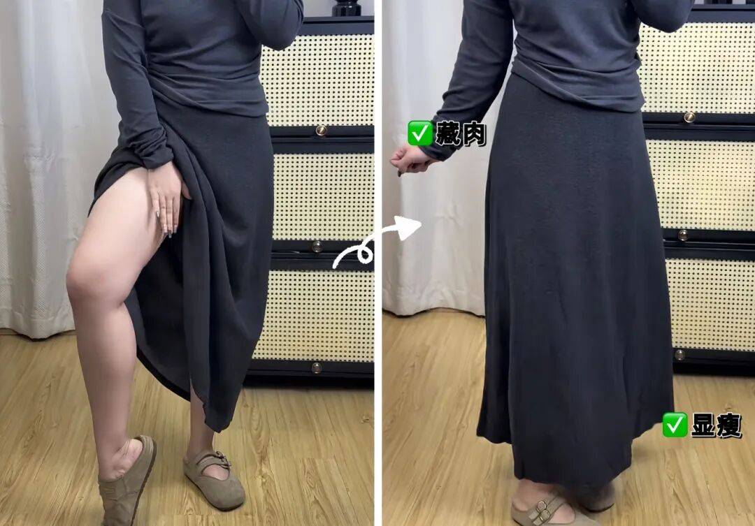 ✅️侧面看,裙摆是从大腿中部才开始散开,小肚子消失无踪。