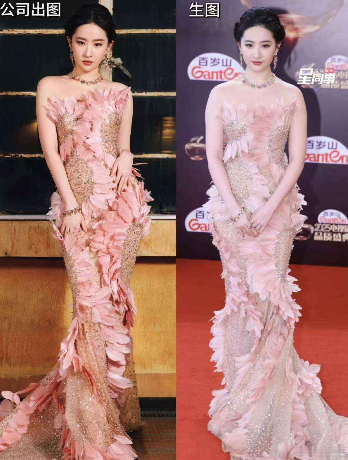 更让人尴尬的是生图和精修图的差别。在国内活动宣传图里,『刘亦菲』的腰部曲线被P得像波浪一样,一眼就能看出后期修图过度。而在外媒的镜头下,高清无修图完全暴露了她的腰线赘肉,甚至连黑色短靴上掉色的痕迹也清晰可见。网友们纷纷吐槽:这还是那个红毯上的直角肩女神吗?从溜肩到头身比例失调,再对比两天前国内活动的状态,简直像换了个人。