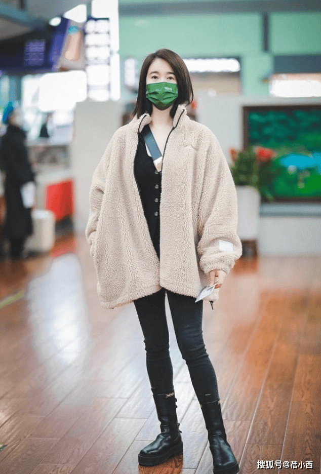 身上这件外套🧥毛绒绒的,不仅手感好,穿身上也具有不错的保暖效果。羊羔毛外套🧥是翻领设计,天冷脖子凉的话直接将拉链全部拉上。这款外套🧥版型较为宽松,为了避免视觉上的臃肿感,女生的个子尽量高一些。再来看看发型,头发柔顺,看到的第一眼就觉得发质很好。头发长度快到左小青的肩膀,与超短发相比,其干练性有所减少,但让人多了份优雅气质。冬天很适合留这种长度的头发,可以遮住女生耳朵,那么就算不戴帽子、耳套,耳朵被冻的概率也会有所减少。