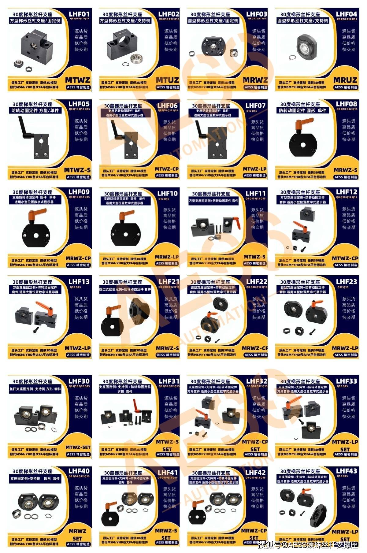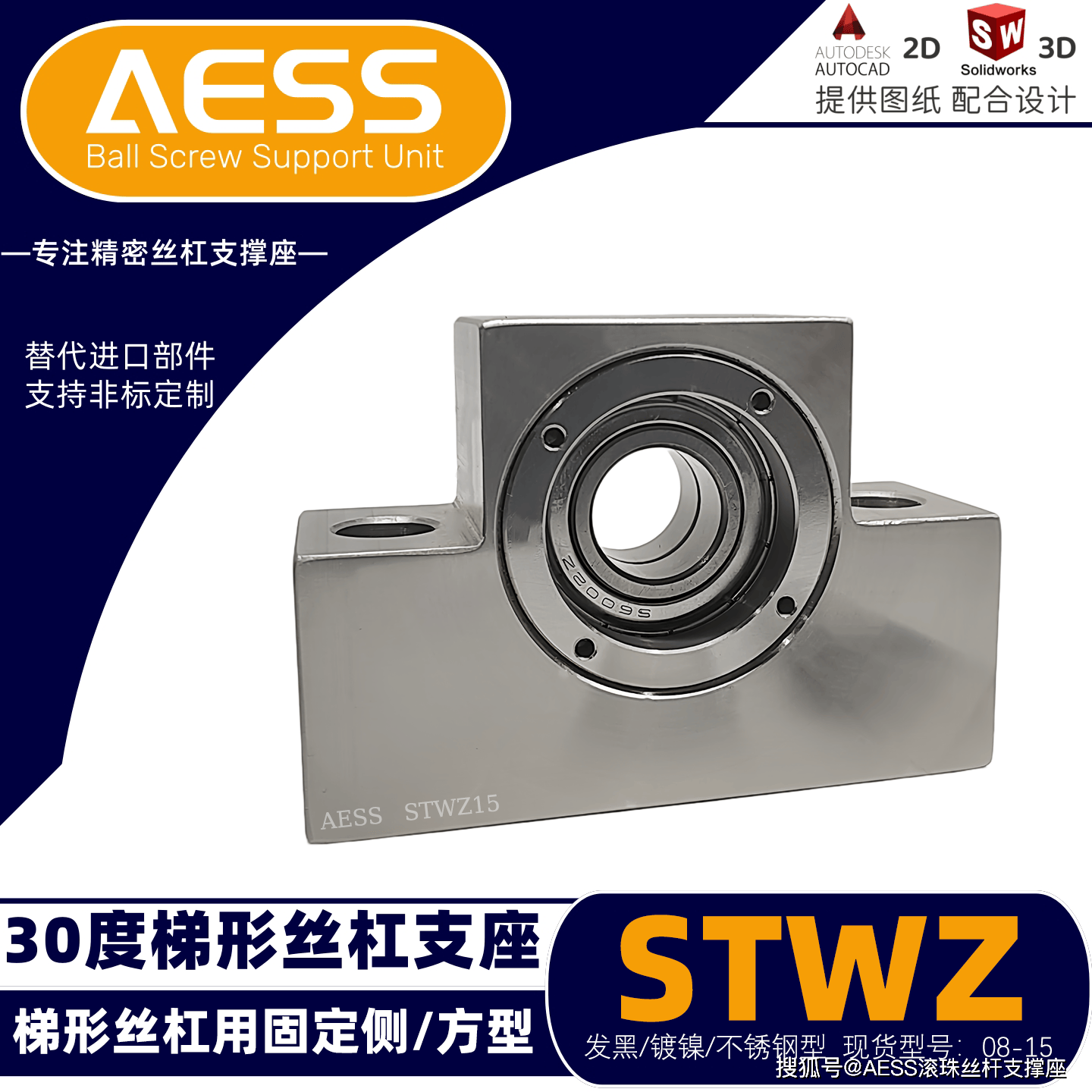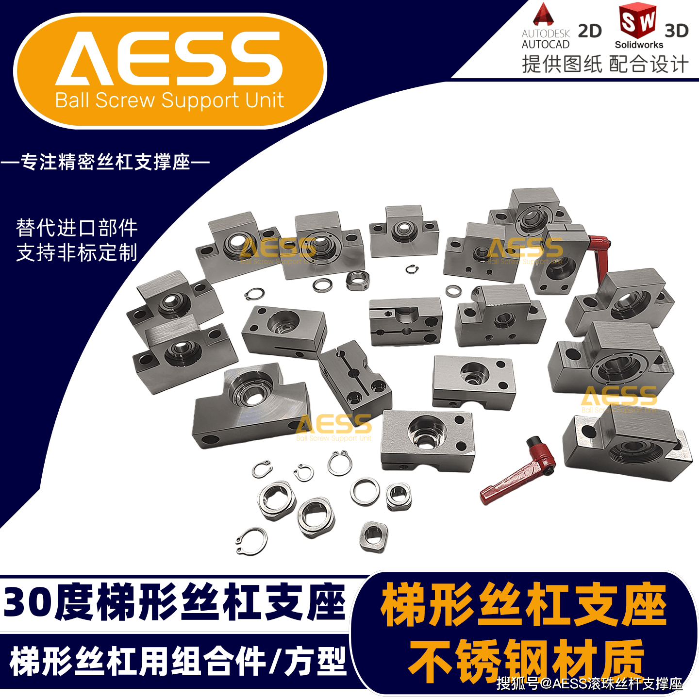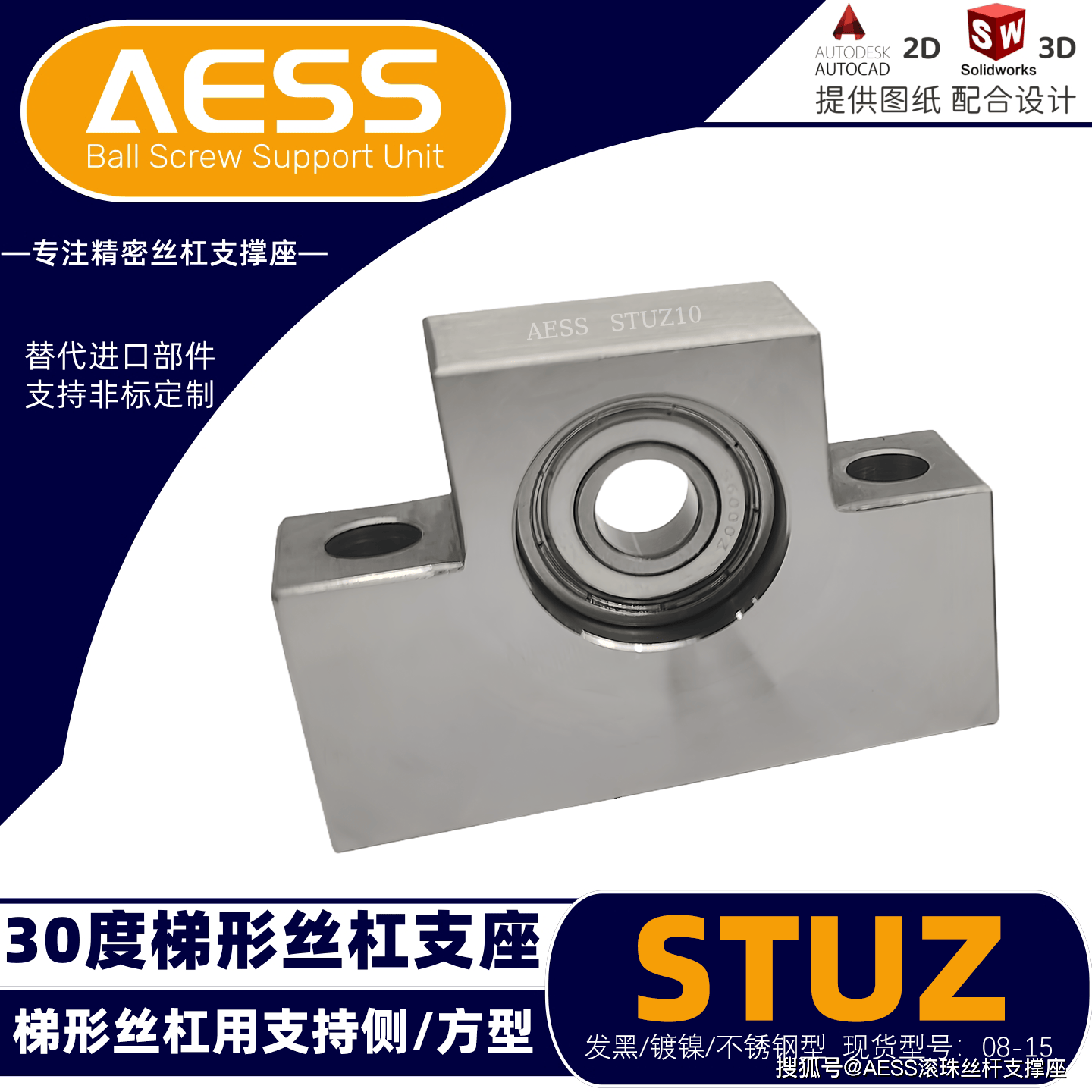 AESS 有 18 年专业研发、生产经验,是全系支撑座生产厂家,可最大限度节省降低采购时间、商品成本。其丝杠支撑座和梯形丝杠支座可完美替代米思米和怡合达等精度标准件型号,专注工厂自动化标准零件替换、非标定制一站式服务,能够根据客户的特殊需求,提供定制化的丝杆支撑座产品,满足不同客户的个性化需求。可以支持表面处理有发黑,镀镍、镀黑铬,材质有不锈钢材质,铝合金材质等,我们工厂能支持不同材质的定制,不同表面处理的定制。全品类型号标准件库存现货,现货急发,交货期快,支持提供2D/3D图纸技术支持!