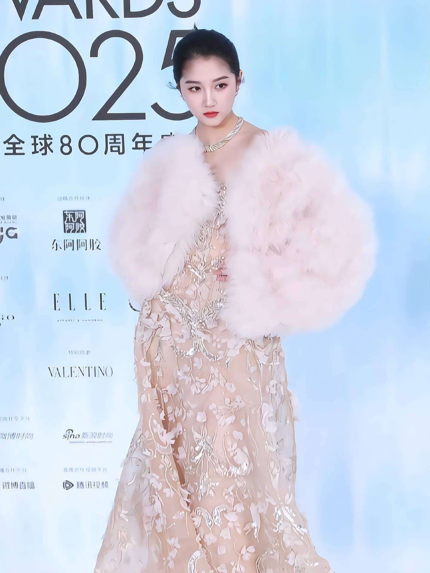 要说这次造型的巧妙之处,首先不得不提她这条裙子👗。Elie Saab的高定可不是什么人都能穿的,这条香槟色的蕾丝裙上满是精致的花朵刺绣,每当风吹起,裙摆便闪耀着光泽,显得格外灵动。而这个颜色恰到好处地衬托了『关晓彤』的肤色,让她看起来白得像发光一样。再加上粉色的毛绒披肩,不仅保暖,还让她整个人多了一份温婉的贵妇气质。现场的媒体都称她为雍容华贵。不过,也有一些网友觉得这个披肩有些土气,似乎与她的清纯气质不太搭配。但不得不承认,这种独特的混搭风格反而让她在人群中脱颖而出,吸引了大量话题和关注。