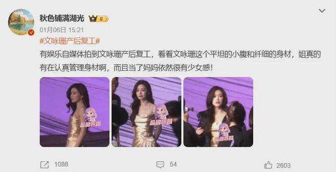1月7日,『娱乐圈』️的『社交平台』突然热闹起来,很多人分享了一组文咏珊复工的照片。照片中,她刚生完孩子两个月,身材依旧保持得很苗条,小腹平坦,穿着金黄色的吊带裙,看起来气质依旧,仿佛没有受到产后恢复的影响。许多自媒体平台纷纷称赞她当妈后依然保有少女感,身材不减反增。