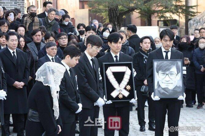 再看队伍最前面,李政宰和郑雨盛作为丧主走在最前头,一个抱着安圣基的金冠文化勋章,一个捧着遗像。郑雨盛的手指关节都攥紧了,好像这样就能多留住前辈一点似的,遗像上的笑容跟现场的悲伤劲儿对比得让人心里发堵。