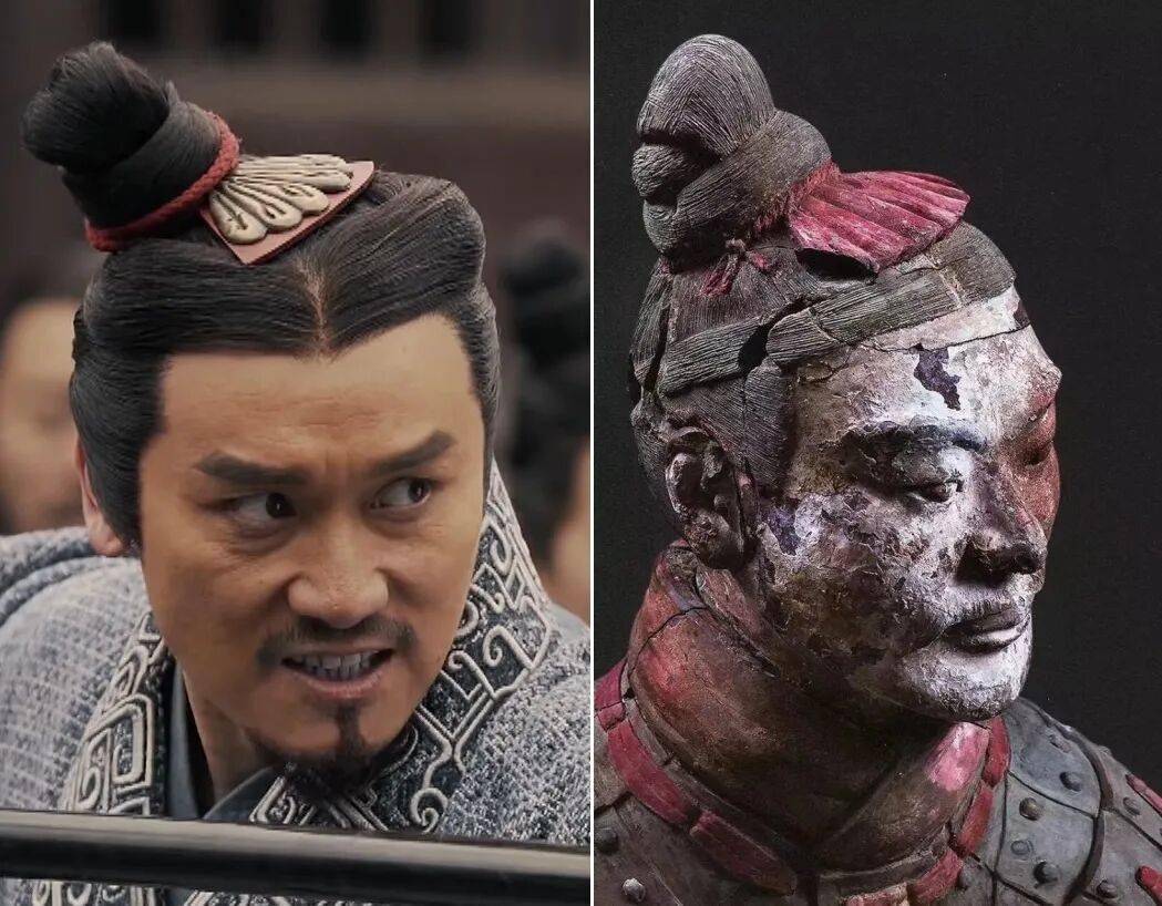 兵马俑中还有梳“歪髻”戴正冠的御手俑,发髻从小冠一侧“漏”出。《大秦赋》的造型设计显然注意到了这个,有几个造型明显借鉴于此。