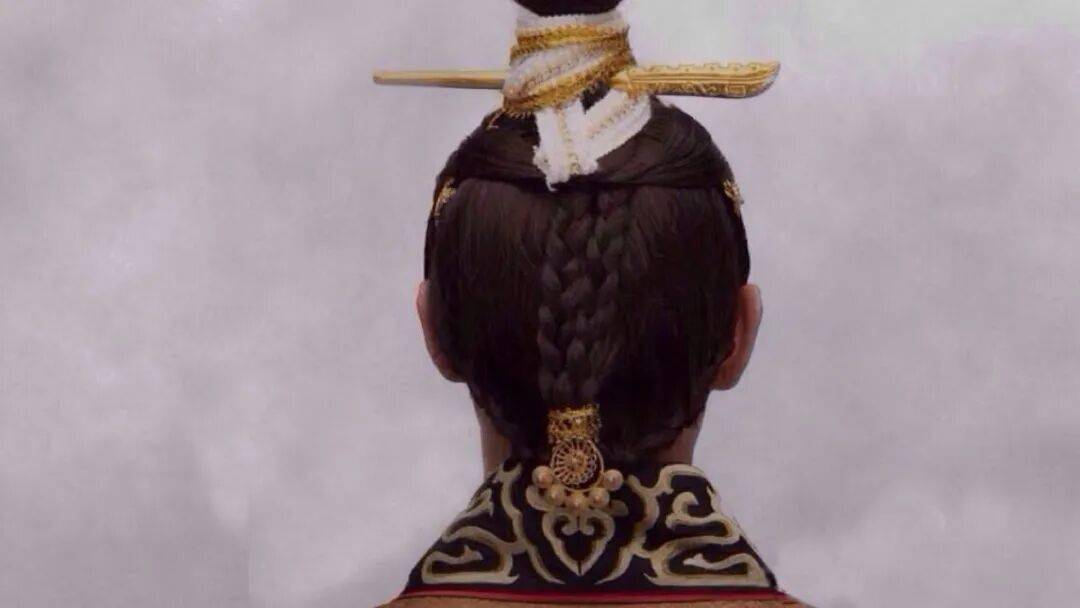 它的另一个引人注意的点则在于发髻背面有各种编辫。由于右歪的发髻太过惹眼,所以很多古装剧往往只选择借鉴背面编辫的造型手法。