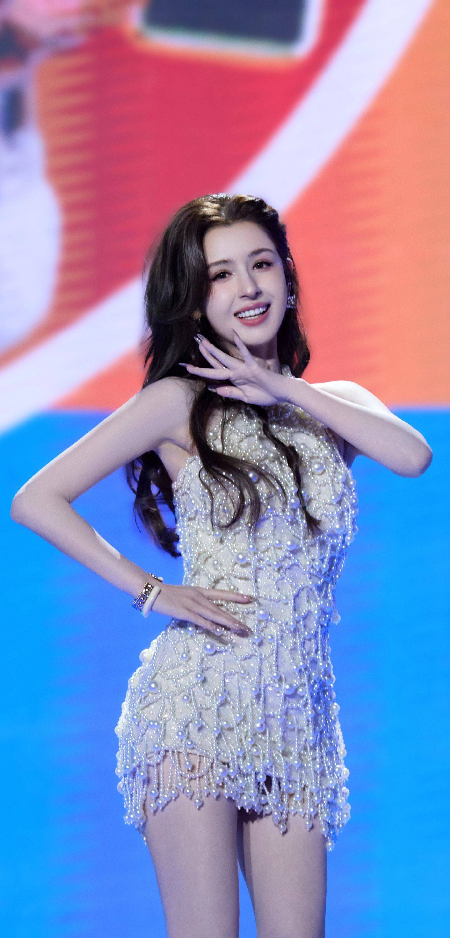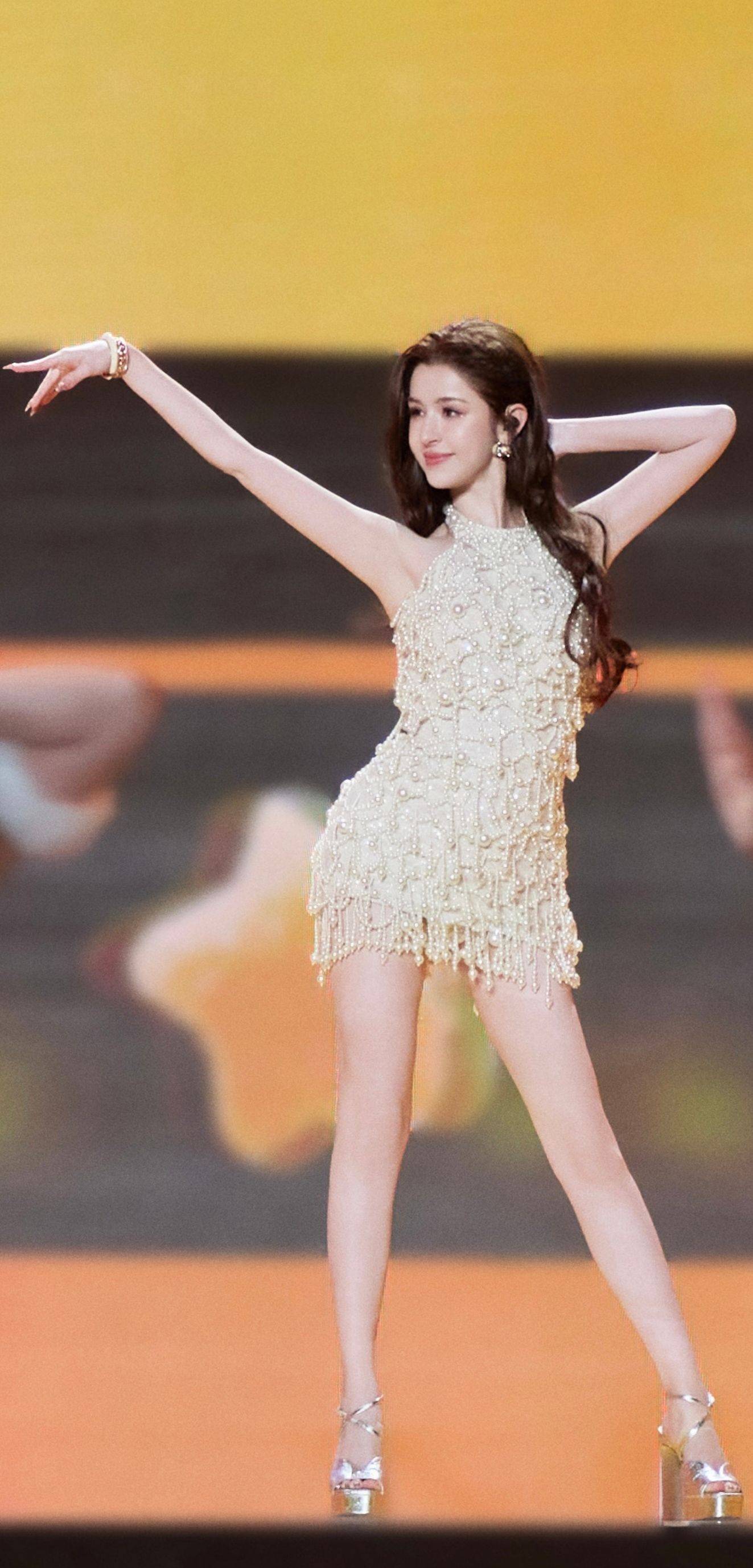 先说说她这身战袍——我的天!全身镶满了珍珠串成的流苏,从脖子挂下来一路垂到大腿,灯光一打整个人像泡在银河里发光。吊带设计露出她精致的锁骨,后背曲线绝了,又薄又有线条感,跳舞的时候珍珠随着动作“唰唰”甩动,每一颗都在发光!短裙长度刚好到大腿根,走动间大长腿若隐若现,配上银色厚底高跟鞋👠,腿长直接两米八既视感!