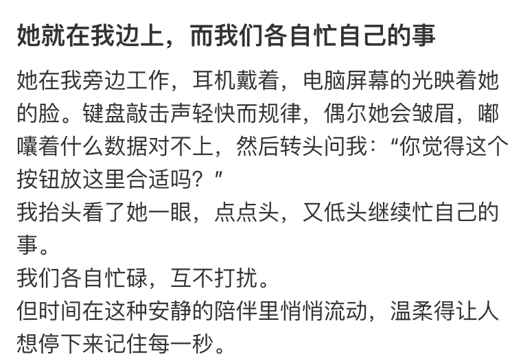 真诚的表达不是拒绝亲密,而是让对方懂自己的节奏,可以试着坦诚地说:“我超喜欢和你聊天,但是每天留1小时做自己的事,可以让我快速恢复精力。”减少误会,让对方知道“不是不理我,只是我们有专属的相处节奏”。