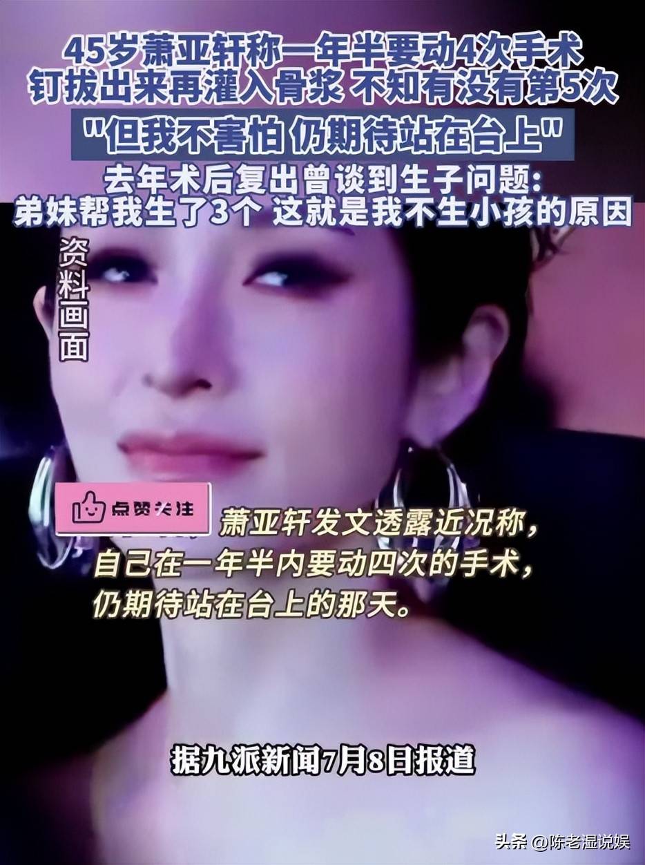 时尚fjmyhfvclm0阅读 没有谁能永远年轻,但萧亚轩的男朋友可以。这句风靡一时的调侃,曾是外界对萧亚轩情感生活的幽默总结。回望她的过往,17段感情,几乎每一任都比她年轻不少,甚至最小的男友比她年轻整整16岁。于是,鲜肉收割机这一标签便牢牢地镶嵌在她的身上,成为了大众津津乐道的话题。可是,曾经在人们眼中活力四射、潇洒自如的萧亚轩,46岁时,却再难寻觅那份无忧无虑的光彩。岁月与病痛的双重摧残,让她不得不为曾经那段放纵的生活买单,身心的负担逐渐沉重。