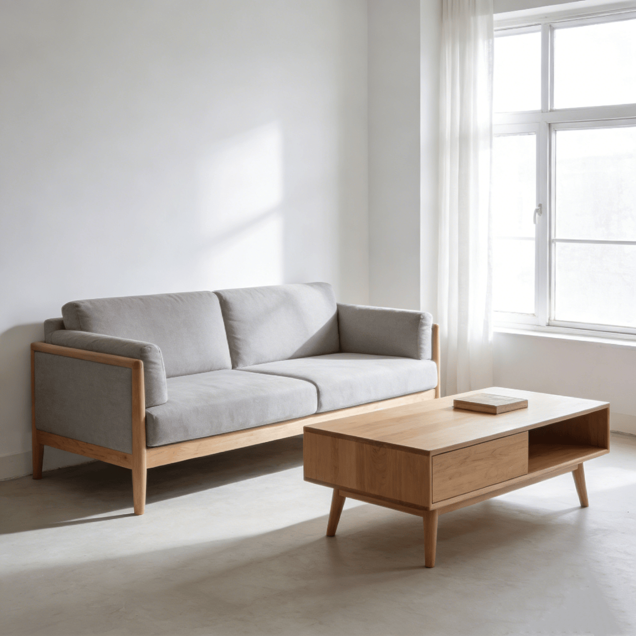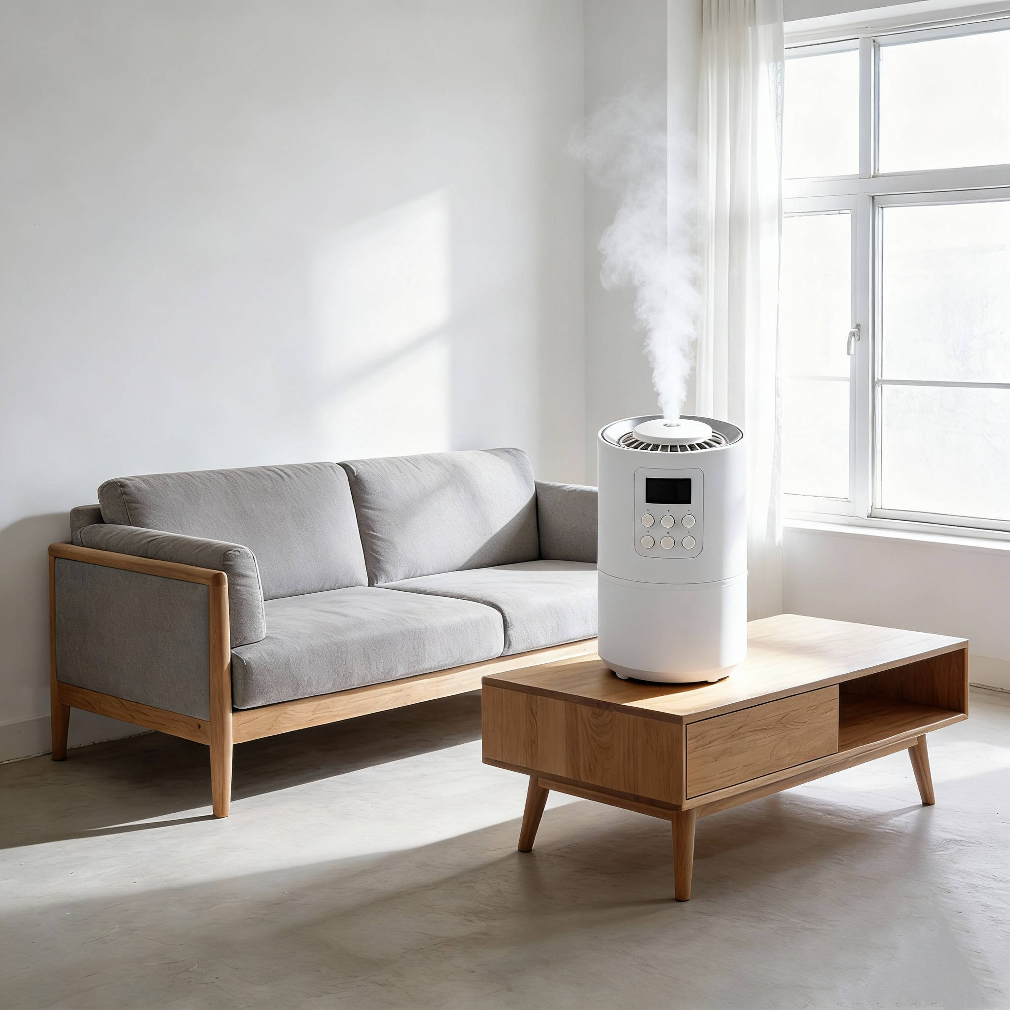 图1:现代简约客厅场景图(浅灰色沙发、原木色茶几、白色墙面,有柔和的自然光从窗户射入);图2:白色超声波加湿器白底图(展示产品外观、出雾口、操作面板)。
