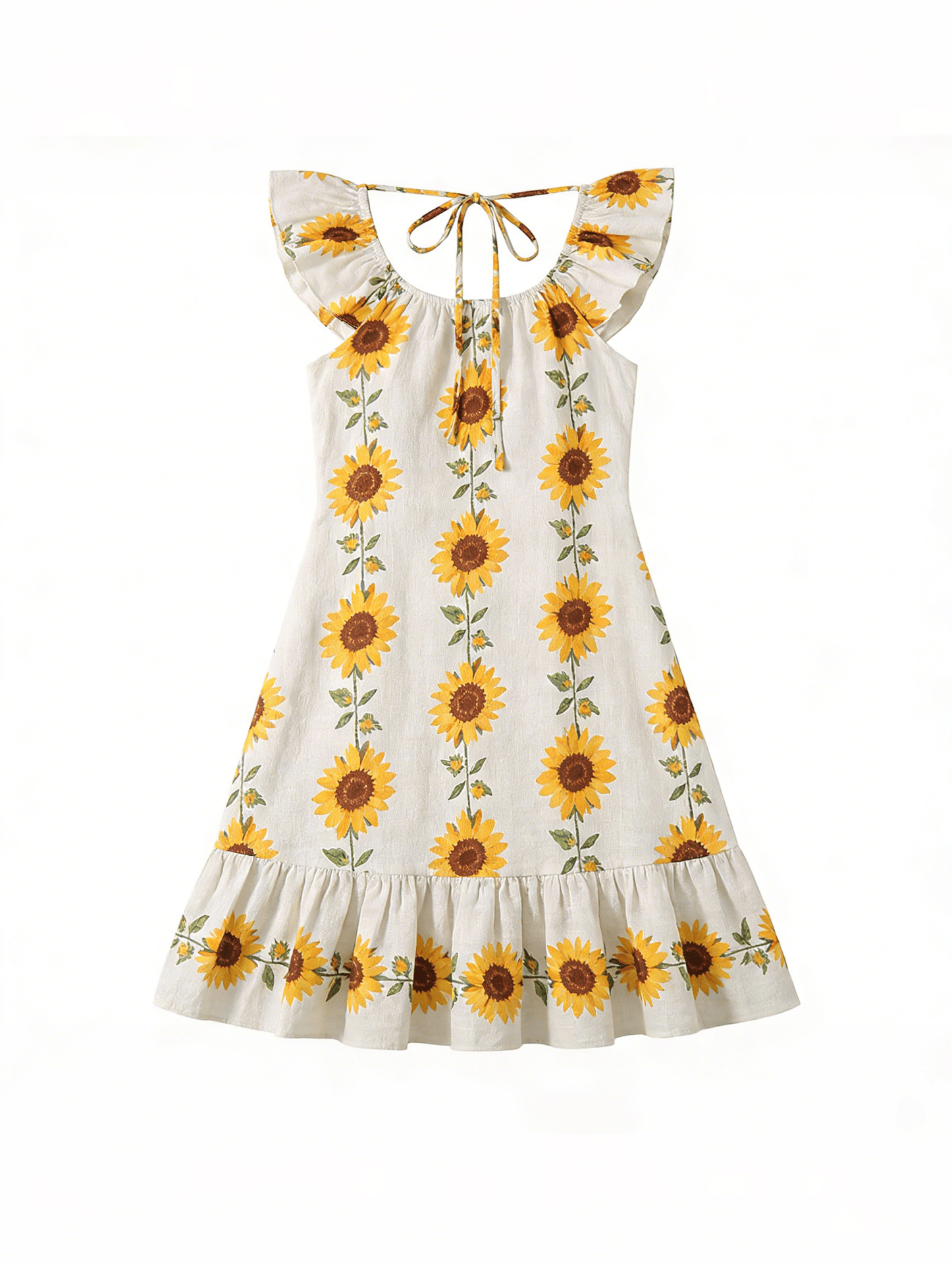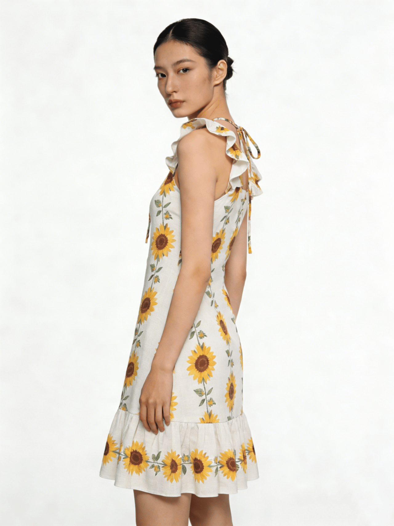 图1:空镜模特图(模特站姿优雅,侧身面向镜头,预留『穿搭』展示空间);图2:新款碎花连衣裙👗白底图(清晰展示裙摆版型、碎花图案、面料质感)。