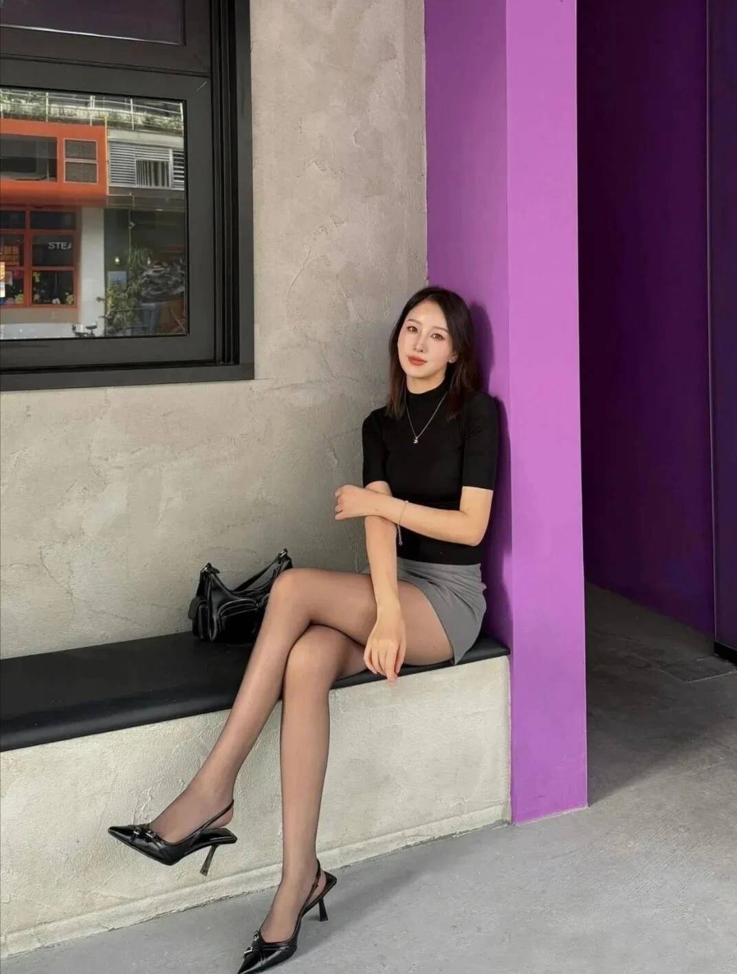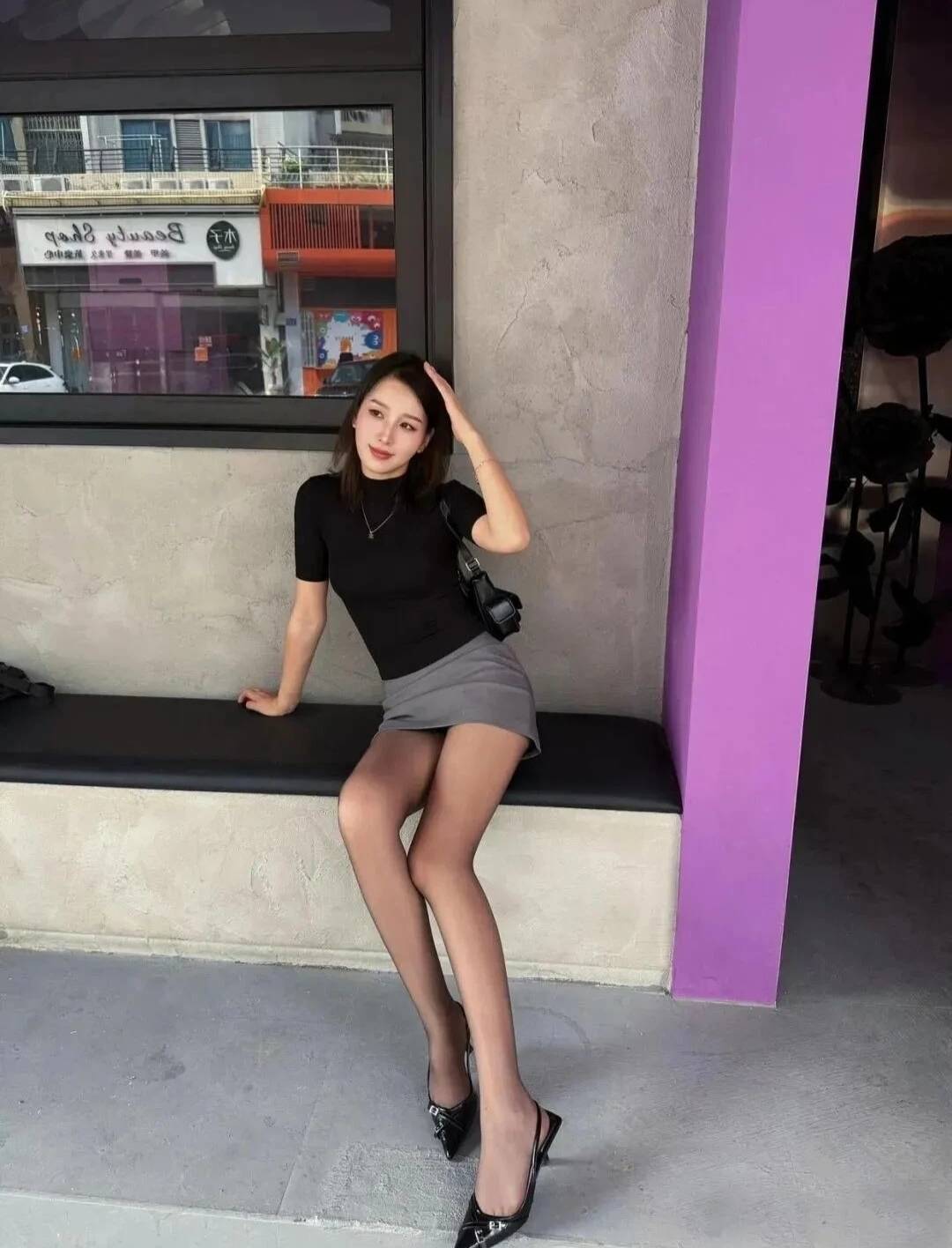 她穿着一件黑色上衣,那黑色,深沉又内敛,就像夜空中闪烁的星辰,虽然低调,却迷人得很。我猜啊,这上衣的材质肯定柔软又贴身,不然怎么能那么巧妙地勾勒出她上半身优美的线条呢?从圆润的肩部,到纤细的手臂,每一处都优雅得恰到好处,就像大自然精心雕琢的艺术品。领口设计简约又不失精致,微微敞开着,露出她白皙得像天鹅一样的脖颈,修长又优雅,让人好生羡慕。她搭配了一条灰色短裙,这灰色,就像清晨山间的薄雾,带着一种朦胧又神秘的美感。裙子👗的长度简直绝了,既把她双腿的修长与笔直完美展现出来,又保留了一份含蓄与温婉。她只要稍微动一动,裙摆就会轻轻摆动,就像微风中摇曳的花朵,散发着灵动的气息。而且灰色和黑色上衣搭配在一起,和谐得不得了,既沉稳又不失活力,让她看起来魅力四射。