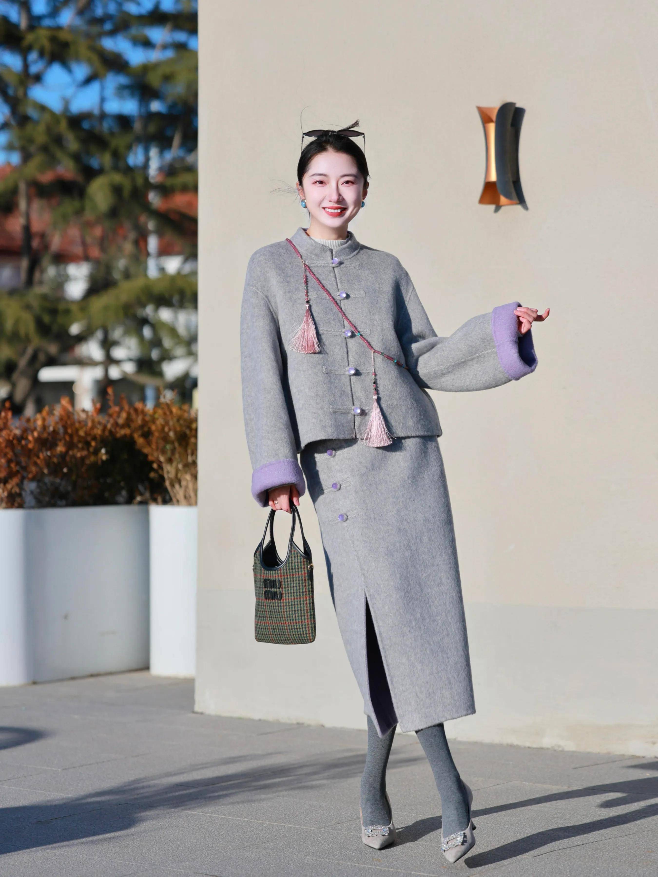 咱们还可以选择用短款的大衣裙装,搭配上一双同样是灰色调的浅口高跟单鞋,这样更容易延伸你的腿部线条,不过鞋跟尽量控制至小于 6cm,穿在脚上不累脚,同时稳定性更好,也更舒适。在寒冷冬季,记得再搭配灰色的保暖打底裤在里面,冷风吹来也不会被冻着。这种新中式的短大衣裙装确实有着不一样的美感,优雅贵气。