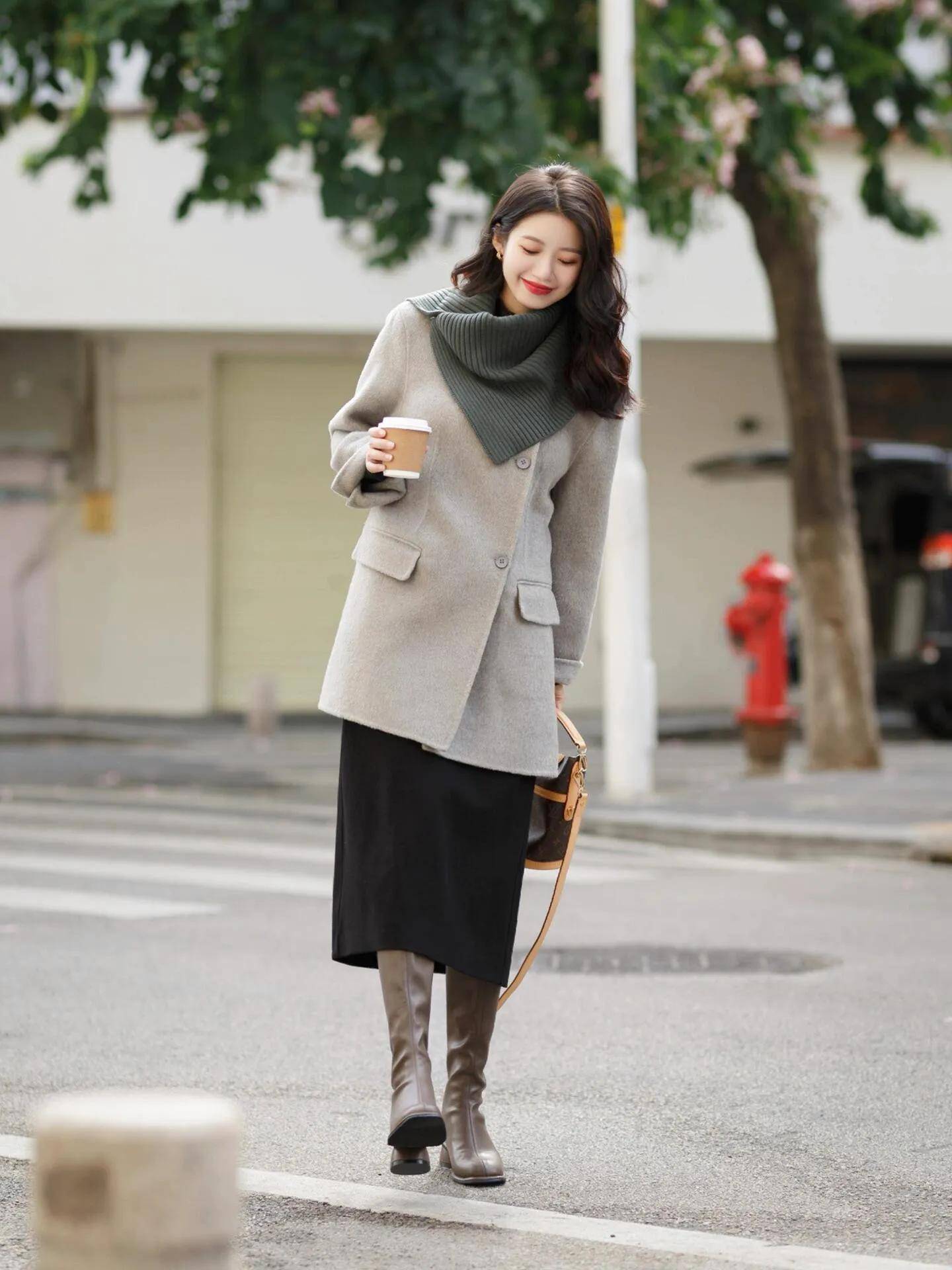 今年真的还蛮流行裙中靴『穿搭』,上面用灰色的短大衣搭配上黑色的直筒半身裙,脚上穿的大地色的粗跟中筒靴,结合大波浪的『卷发造型』,散发出了不一样的女性♀️魅力温柔优雅又大方。