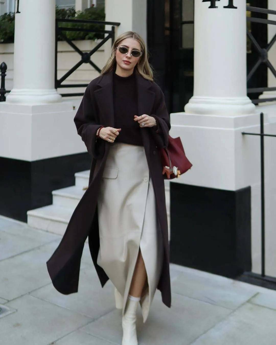 我们可以用奶白色的大衣内搭米白色的裙装,脚穿一双同色系的粗跟中筒靴,手里提了一款白色的小包,这种纯净的白能使得『穿搭』者更精致洋气,有一种高贵的气质感降低了穿衣拍摄的出错率。