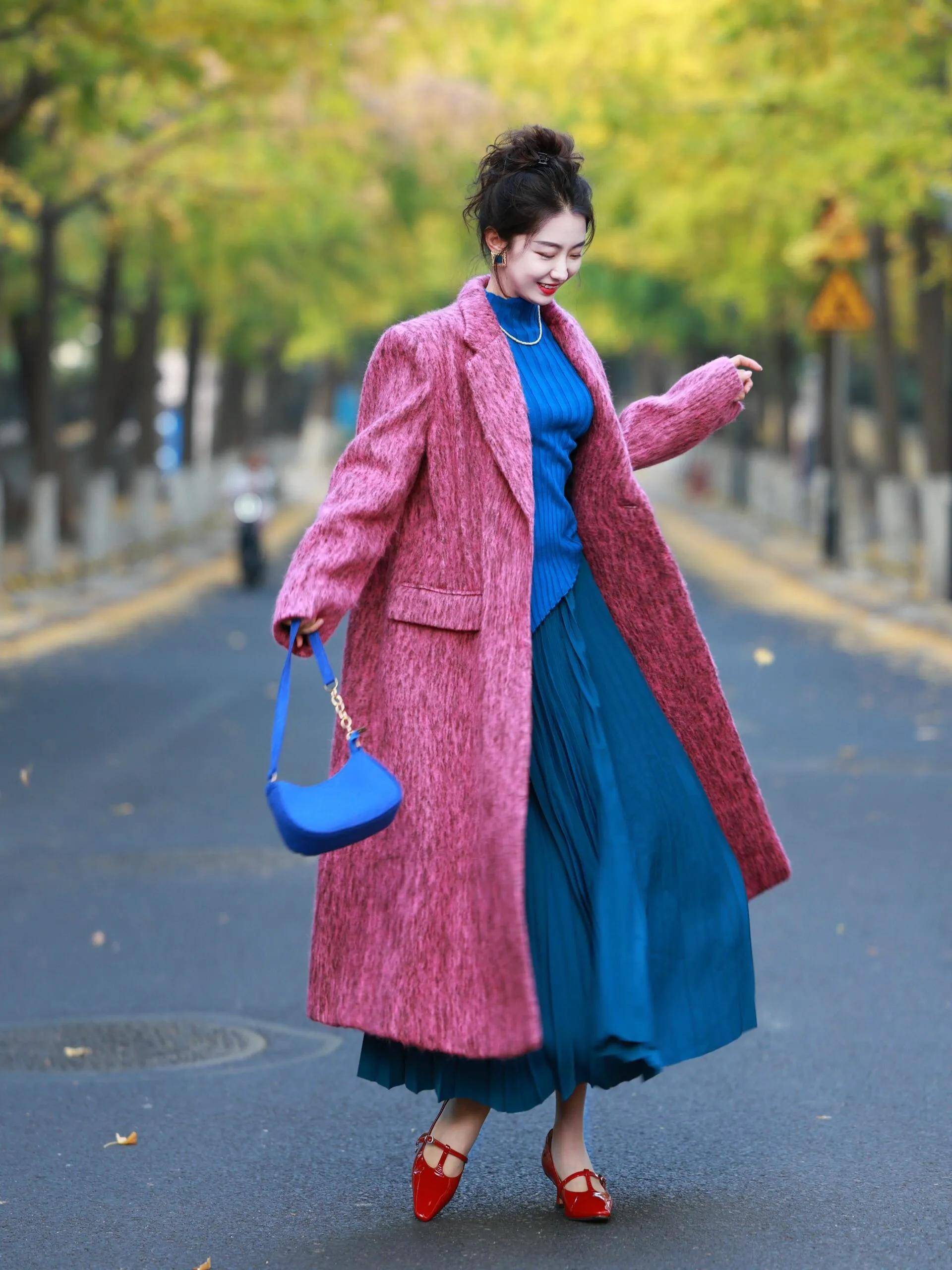 例如,上面这一件粉紫色的翻领大衣,内搭蓝色毛衣和一条百褶的伞状半身裙,脚要穿红色的浅口单鞋这样的创意造型很有时尚感。