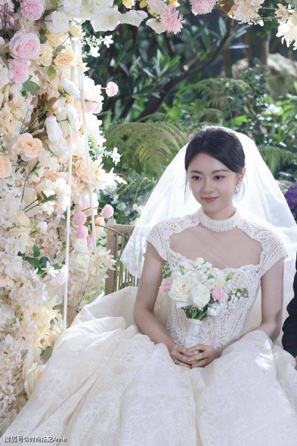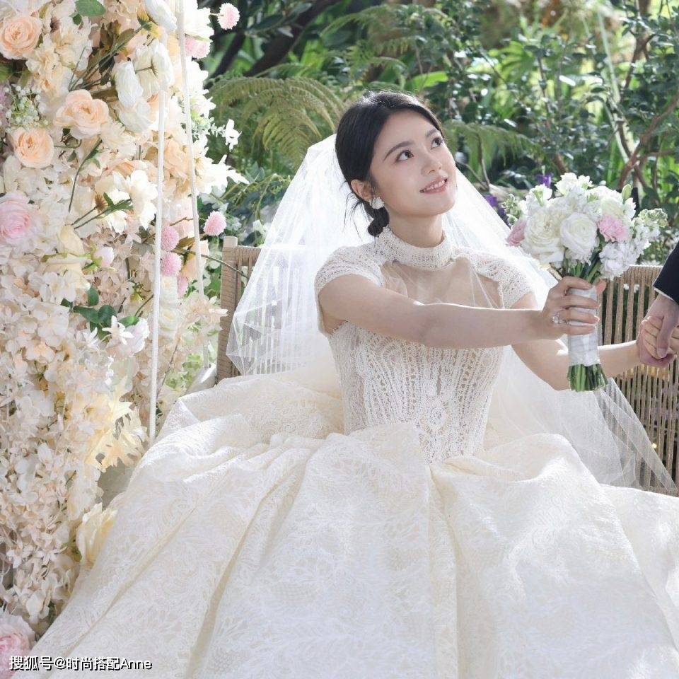 当『赵今麦』穿着米白色蕾丝婚纱出现的瞬间,真的会让人想起《初恋这件小事》里的校园女神!这套造型最妙的是高领挖空设计:既保留了复古宫廷风的端庄,又通过颈部镂空展现天鹅颈线条。她手持的手捧花,白色玫瑰象征纯洁,粉色康乃馨带着少女的娇羞,与她盘发间垂落的碎发形成绝妙呼应。