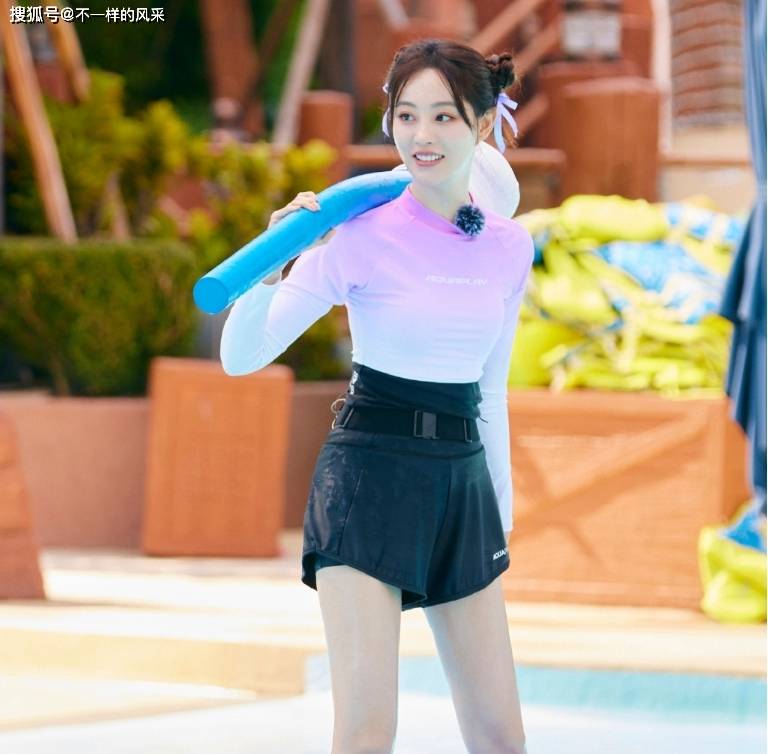 要说这套『穿搭』的精髓,那必须是藏蓝与粉色的 “死亡撞色”—— 哦不,是 “神仙撞色”!冷艳的藏蓝色像是深夜里的静谧星空,甜酷的粉色则像春日枝头的樱花炸弹,这俩看似八竿子打不着的颜色,被祝绪丹穿在身上居然生出了 “又飒又嗲” 的奇妙化学反应。粉色紧身衣像是量身定制的 “身材放大镜”,该凸的凸该翘的翘,每一寸曲线都在说 “看我看我”;而藏蓝短裙的长度刚好卡在最显腿长的位置,仿佛自带 10 级拉长滤镜,让人忍不住想喊:姐姐的腿不是腿,是塞纳河畔的春水!这撞色搭配,谁看了不迷糊?我愿称之为 “2024 年度次元『穿搭』模板”!
