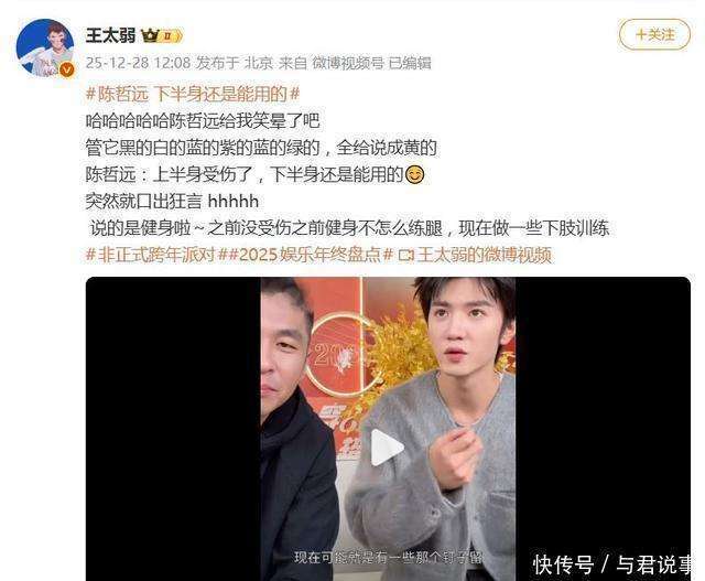 上半身受伤了,下半身还是能用的。这句话让演员『陈哲远』以一种意外的方式迅速冲上了热搜。乍听之下,这种虎狼之词让人愣住,实则背后藏着一场直播中的嘴快脑慢式口误。 12月27日,『陈哲远』在直播时被问到自己锁骨术后的恢复情况。他直言不讳地表示,肩膀尚未完全恢复,因此目前无法进行常规的上肢力量训练。话说到这里,他的思绪一转,想要说明自己并未停下锻炼,而是调整了训练重点。于是,他脱口而出:下半身还是能用的。话一出口,他可能也意识到这句话的歧义性太强,便立刻补充道:说的是练腿。这时他想强调的是,自己最近的锻炼主要集中在腿部训练上。