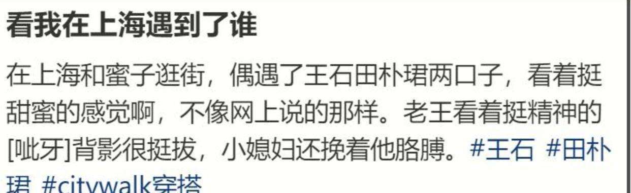 近日,上海街头有网友拍到了一组王石与田朴珺的温馨画面。画面中的夫妻俩手挽着手,背影看上去甜蜜无比,仿佛透露出一种温暖的幸福感。